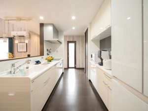▲キッチンは、注文住宅ならでは!お施主様の使い勝手に合わせて全体的な高さを高めに設定。