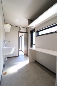 ▲キッチン裏に水回りスペースを確保。造作のカウンターもあるので、家事も最短距離で完結可能です。