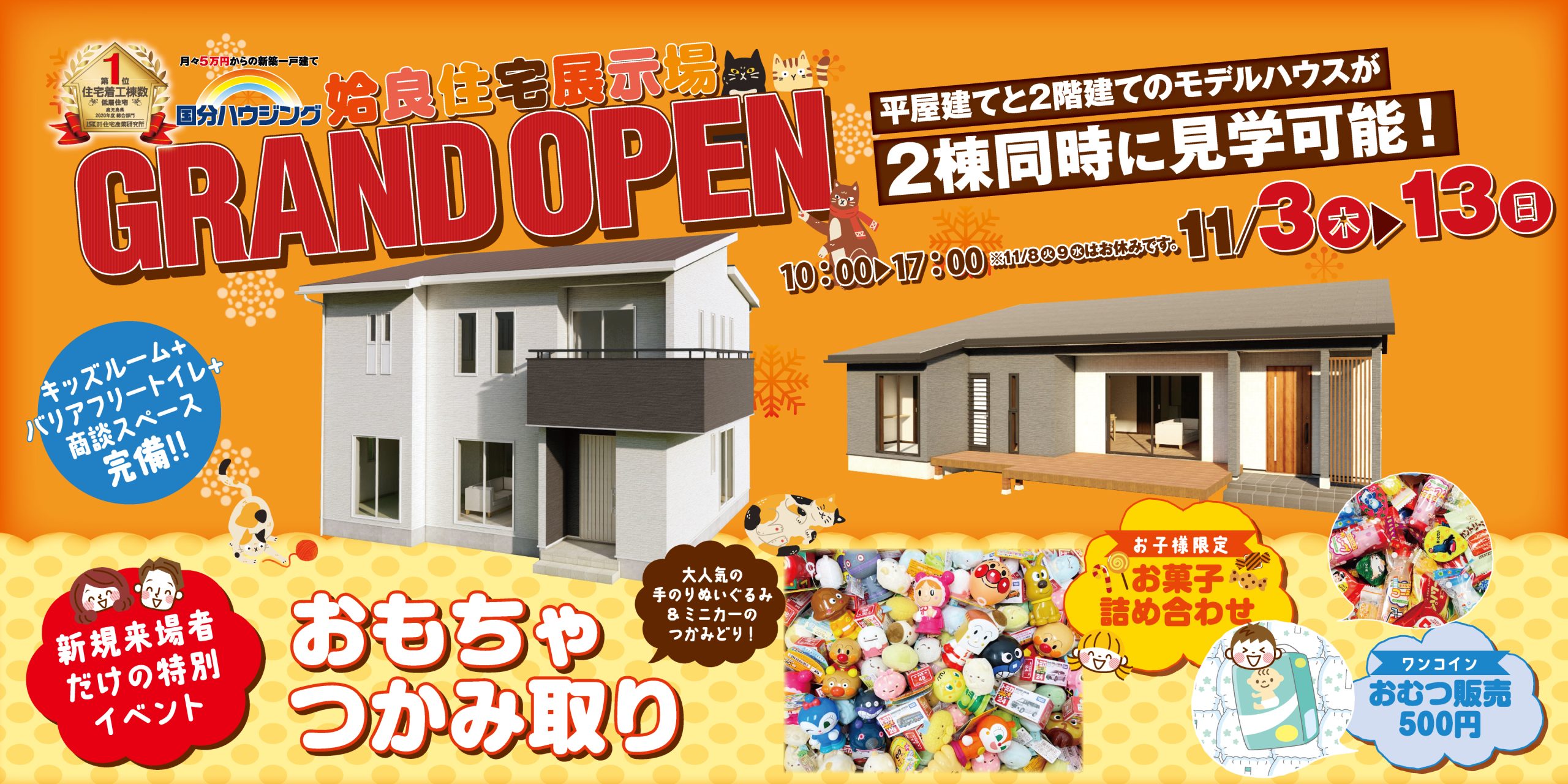 期間中、初めて姶良展示場のモデルハウスをご見学いただいたお客様を対象におもちゃのつかみ取りやお菓子の詰め合わせなどをご用意♪