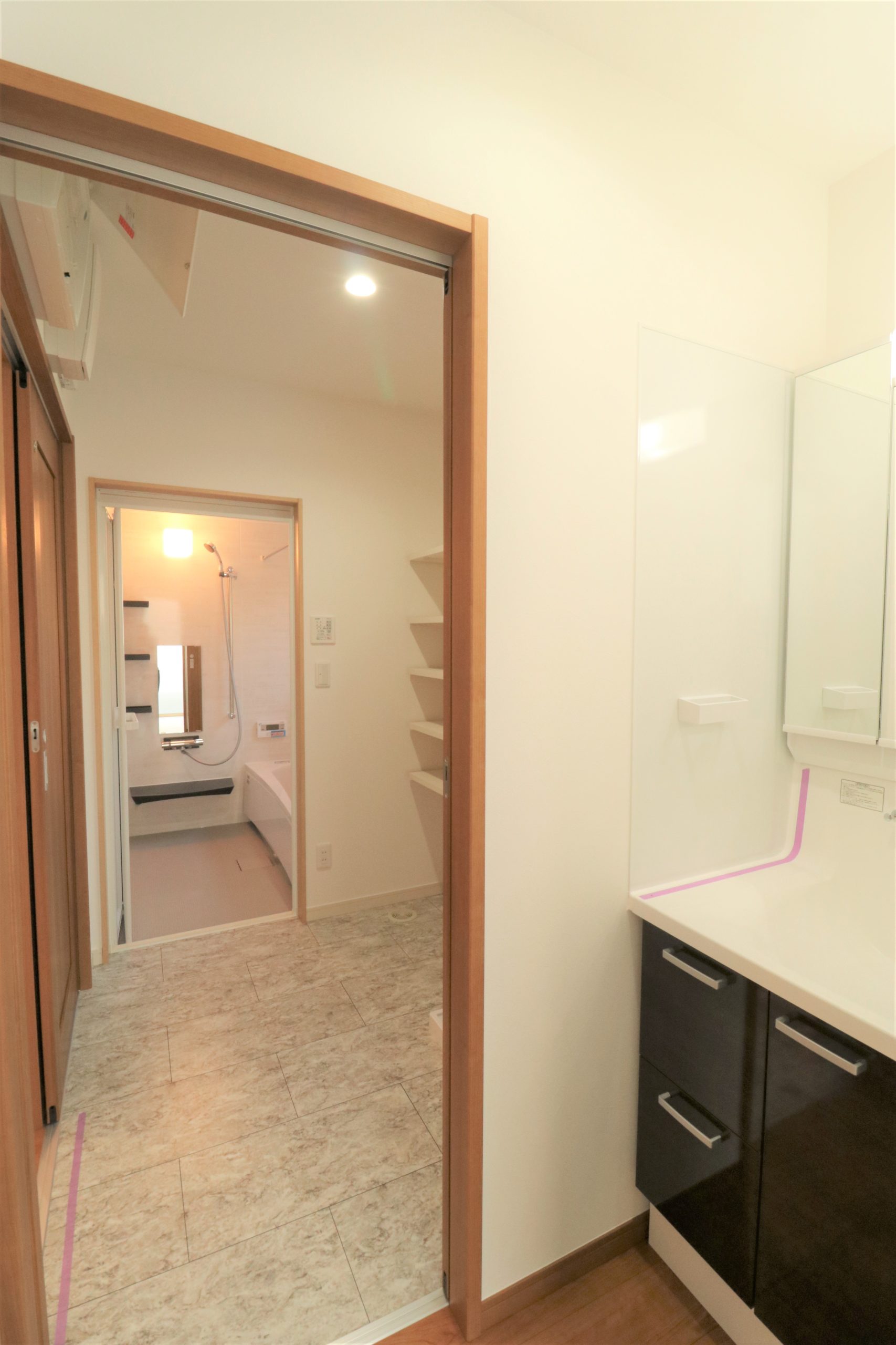 ▲脱衣所と洗面台を別々にしたことで、家族の入浴中も気を遣う必要なし。お子様が成長してからも仲良く暮らせる工夫の一つ。