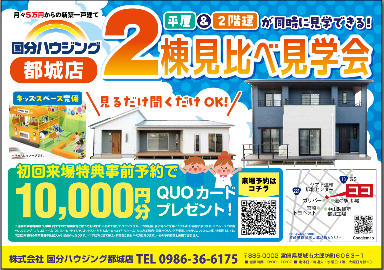 国分ハウジングの都城店には子育て世代に人気の間取りを取り入れた平屋と二階建てのモデルハウスが2棟常設!