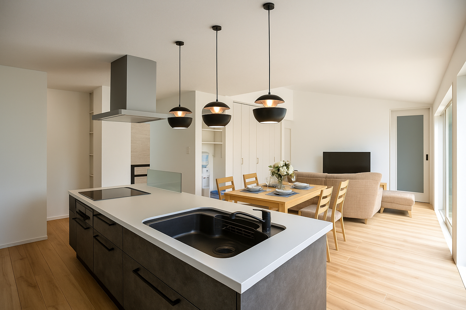 視線を遮らないフルフラットの対面キッチン。リビングで寛ぐ家族と会話を楽しみながら、開放的な気分で料理ができる特等席です。