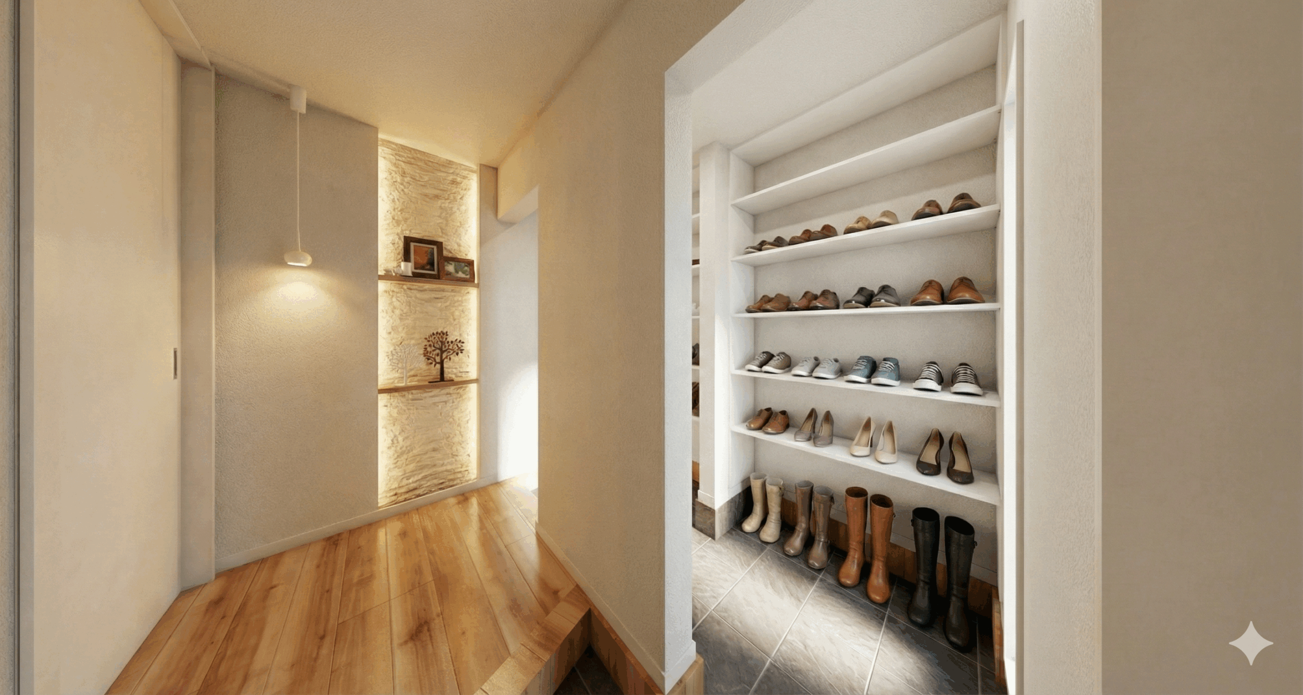 家族は収納側から、お客様はホールへ。動線を分ける「2way玄関」なら、靴が散らからずいつでも美しい空間を保てます。