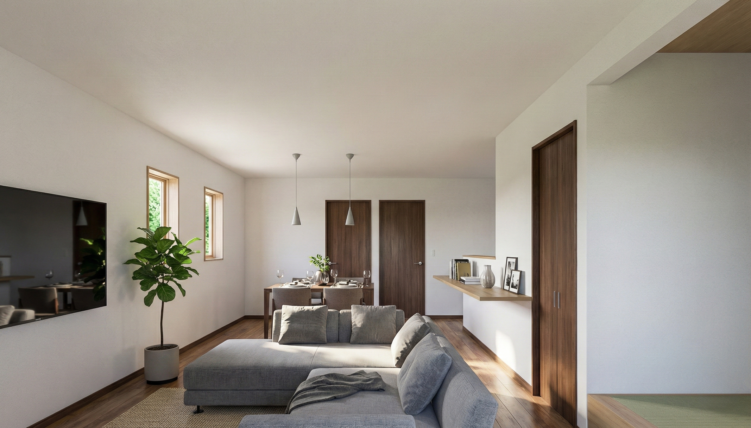 吊押入れと間接照明を採用し、視覚的な広がりと奥行きを演出。モダンで落ち着きのある憩いの空間です。