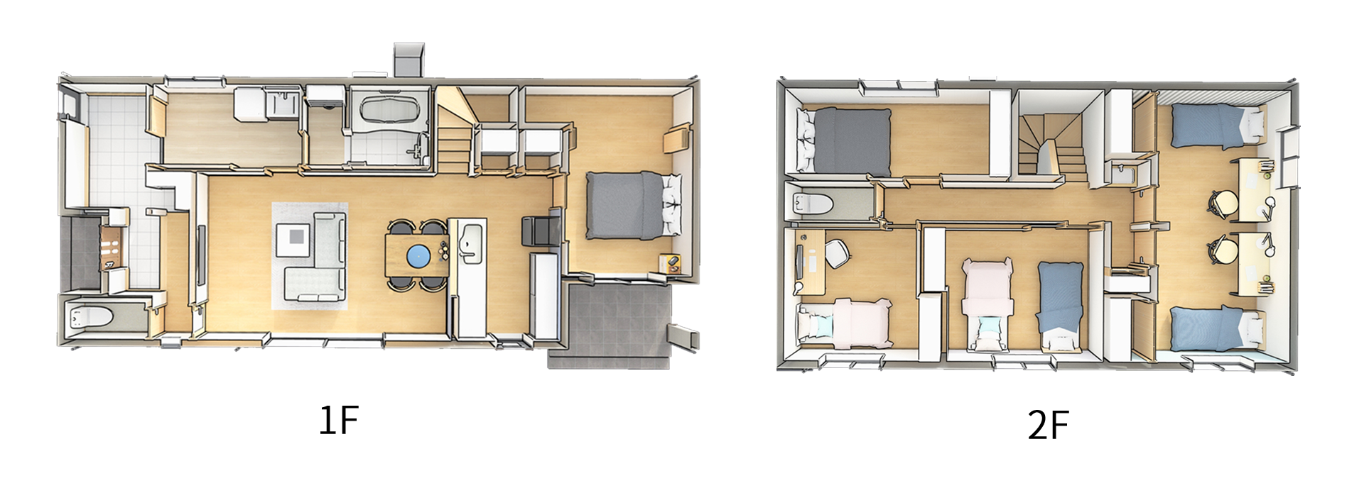 玄関から洗面へ直行できる帰宅動線で、リビングに汚れを持ち込ませません。1階主寝室はタイルデッキと繋がり、平屋のような優雅な暮らしを実現。2階にも洗面を完備し、6LDKでも朝の混雑知らずの快適設計です。