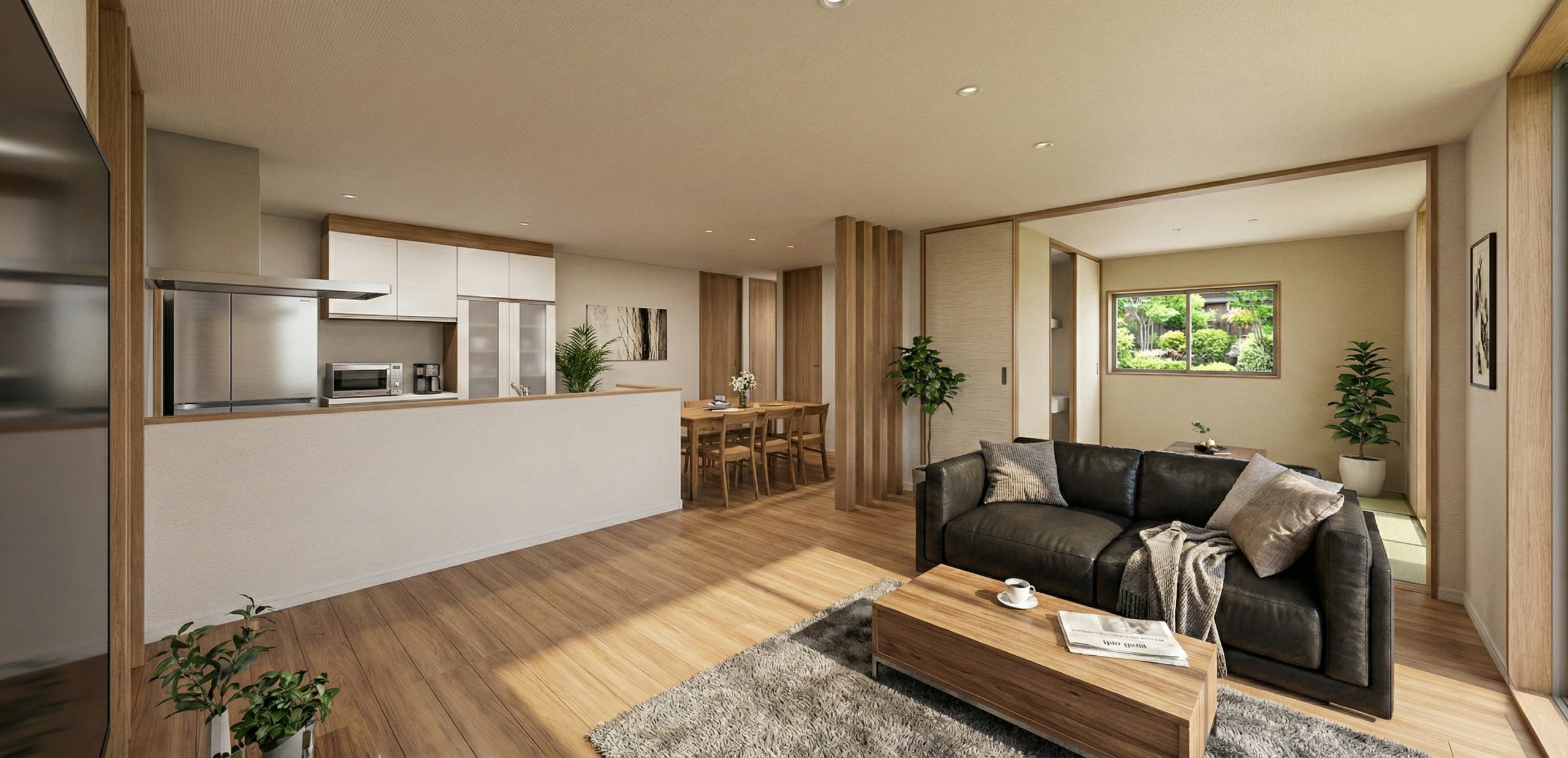 リビングの隣に位置するこの和室は、縁なし畳を採用したモダンな仕上がりが特徴です。最大のご注目ポイントは、生活感を隠しながらも利便性を高める大型の壁面収納。扉を閉めることで独立した個室としても機能し、ゲストルームや自分時間を楽しむ空間に最適です。洋の暮らしに和の寛ぎをスマートに融合させた、多目的で贅沢な一室です。