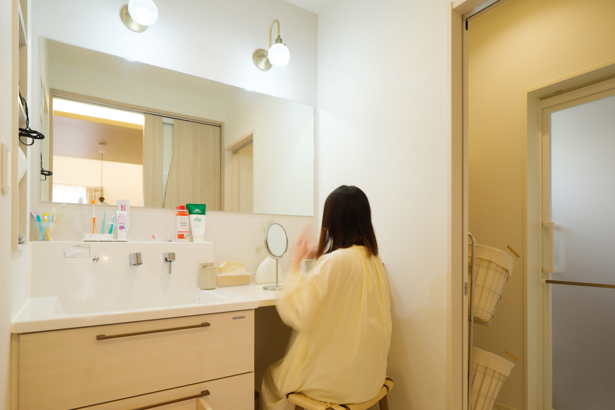 明るく清潔感のある洗面スペース。大きなミラーとゆとりのあるカウンターで、朝の身支度も快適に行えます。隣接する脱衣室ともつながり、動線の良さにも配慮された使いやすい空間です。