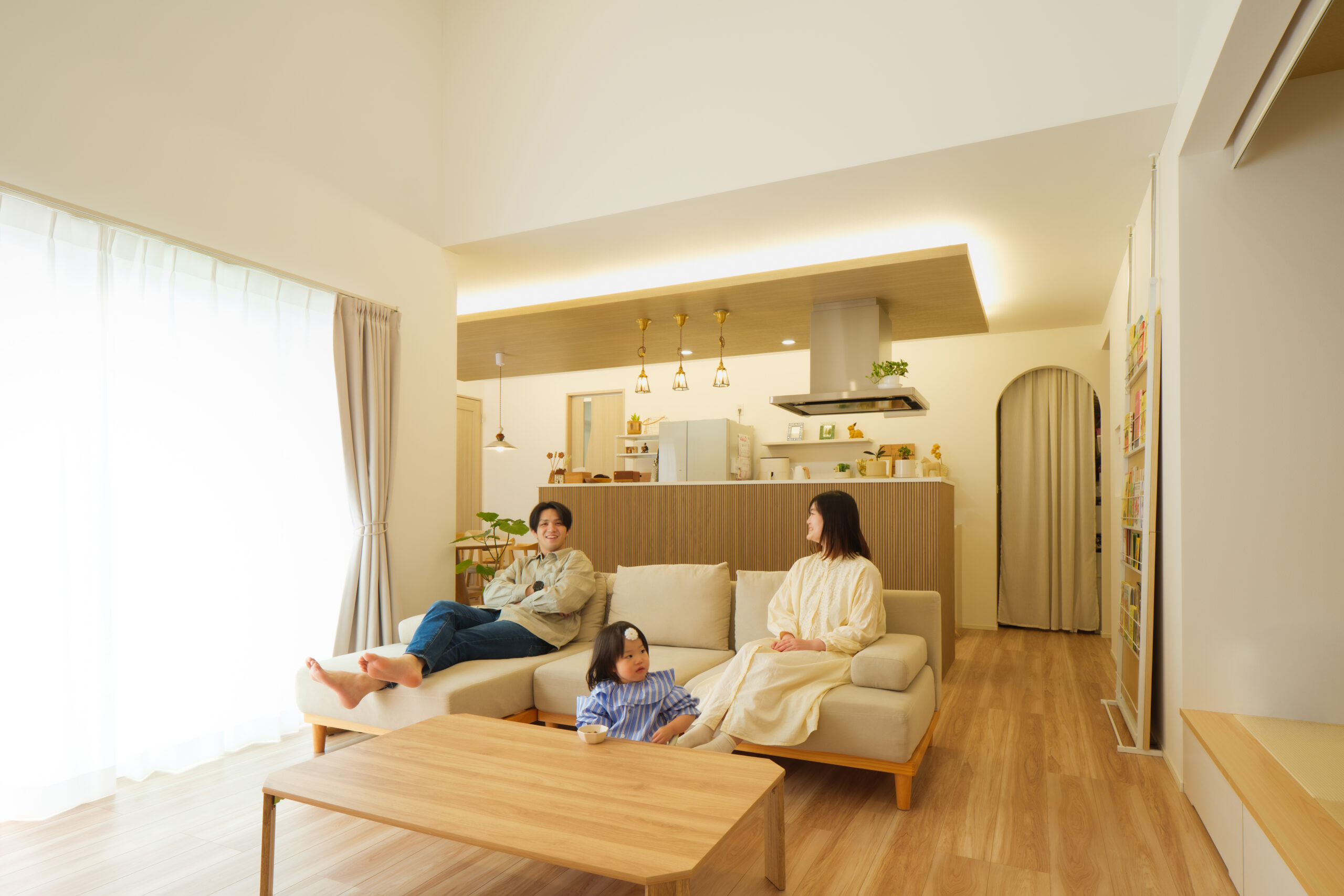 大きな窓からやわらかな光が差し込む、明るく開放的なリビング。木目を基調としたナチュラルな空間に、折り上げ天井や間接照明がアクセントとなり、上質な雰囲気を演出しています。キッチンまでゆるやかにつながる間取りで、家族が自然と集まる心地よい空間です。