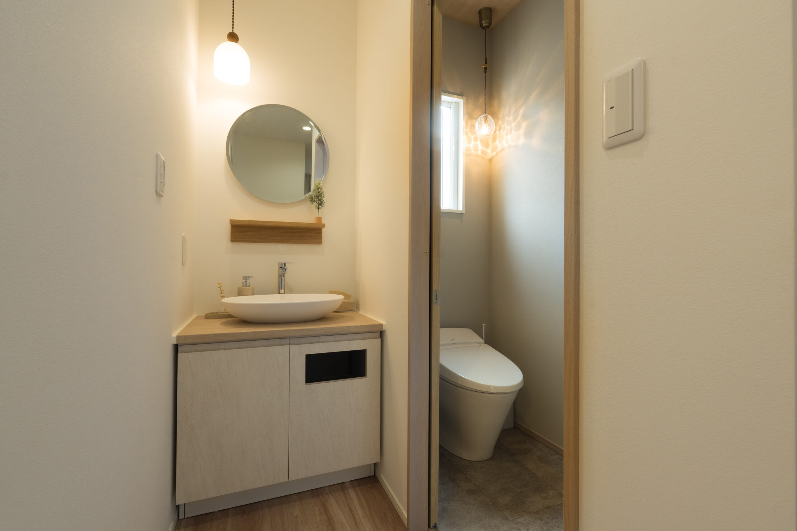 コンパクトながらもこだわりを感じるトイレ空間。隣には丸いミラーとカウンターを組み合わせた造作洗面台を設け、デザイン性と使いやすさを両立しています。やわらかな照明が空間を優しく照らし、落ち着いた雰囲気に仕上がっています。