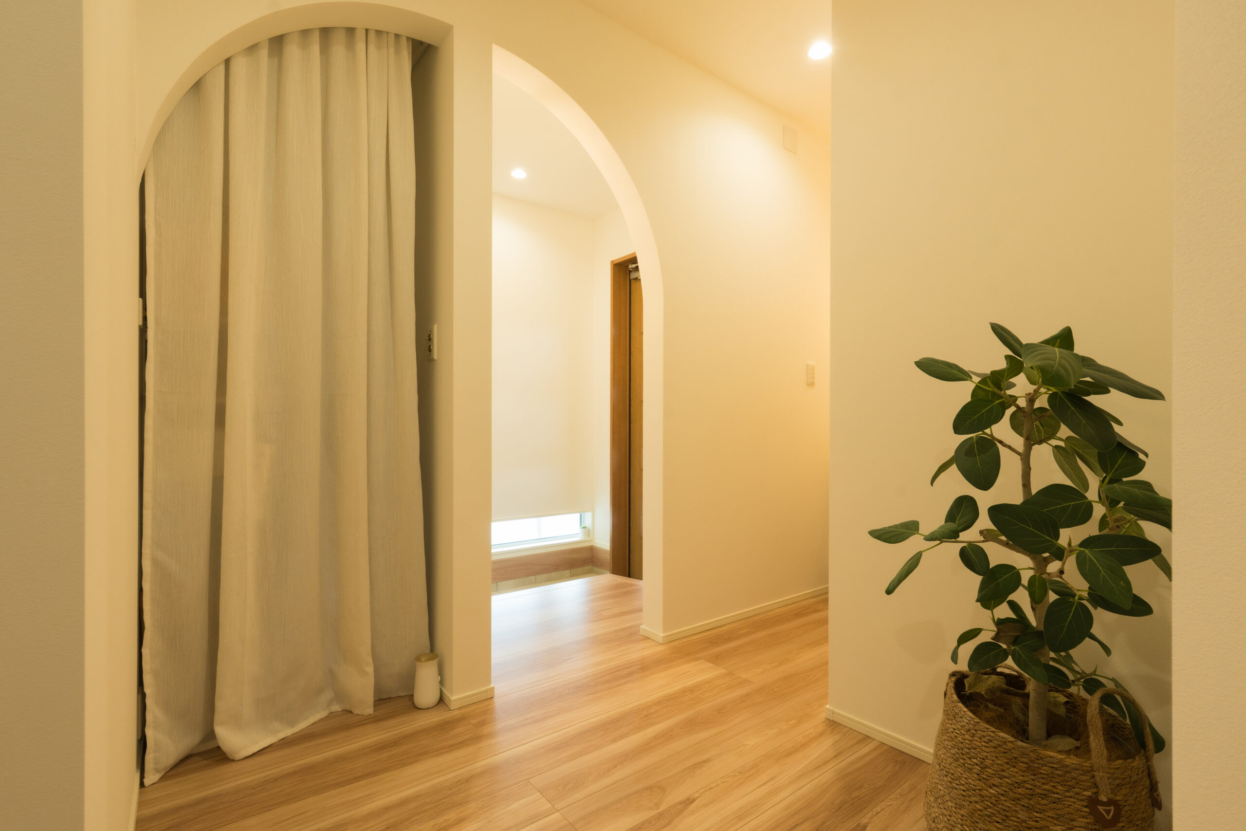やわらかな曲線が印象的なアーチ開口を取り入れた玄関ホール。ナチュラルな床材と優しい色合いでまとめられ、温かみのある空間に仕上がっています。視線の抜けを意識した設計で、奥行きと広がりを感じられる心地よい玄関です。