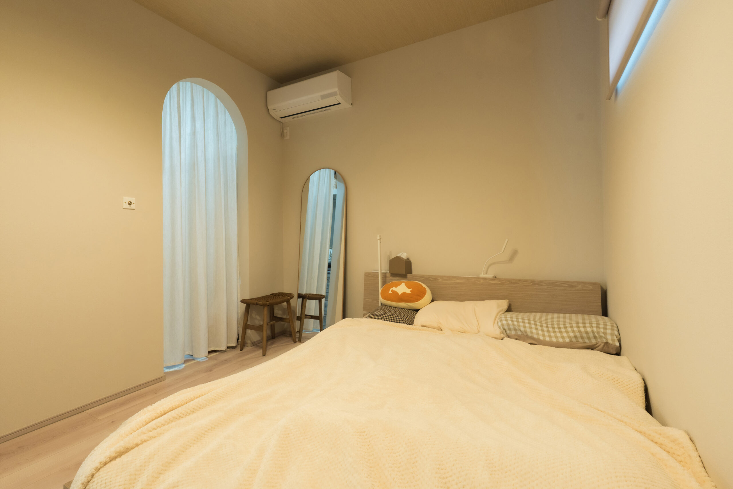落ち着いた色合いでまとめた、リラックスできる寝室空間。アーチ開口ややわらかな照明が、やさしい雰囲気を演出しています。シンプルなレイアウトでゆとりを持たせ、心地よく過ごせる空間に仕上がっています。