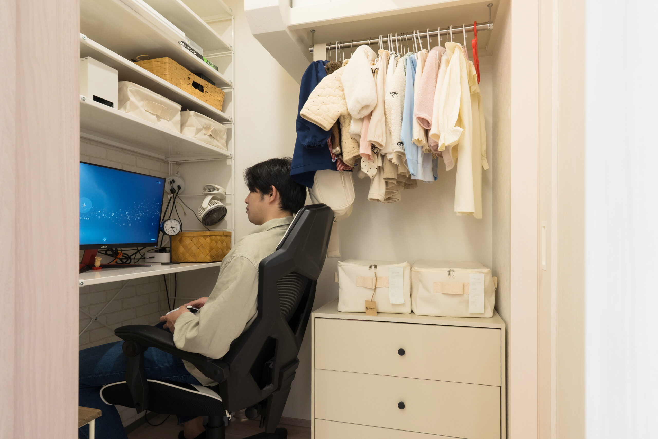 収納と書斎を兼ねた機能的なスペース。衣類や日用品を収納しながら、デスクを設けることで作業や趣味にも集中できる空間になっています。限られたスペースを有効活用した、使い勝手の良い設計です。