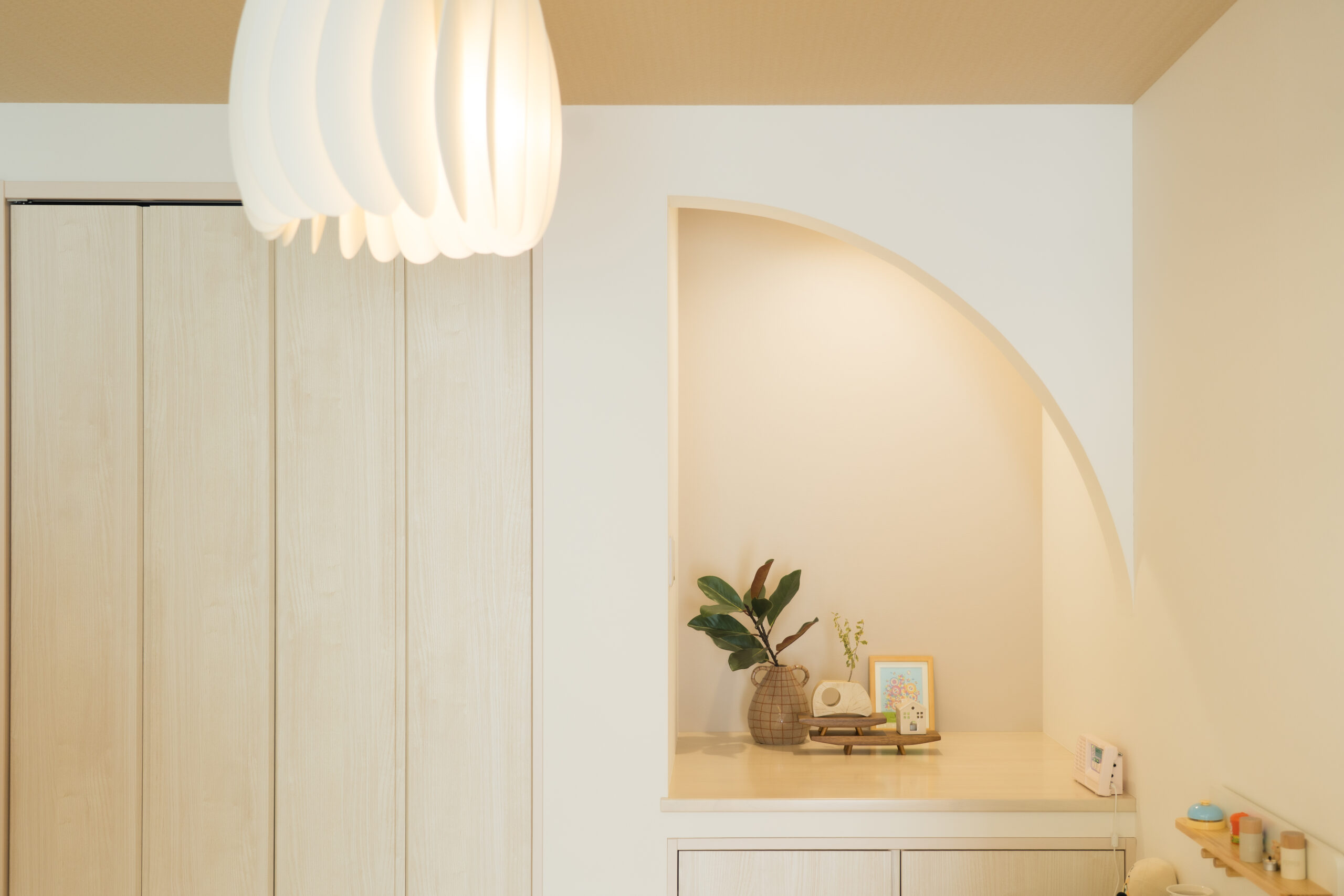 やわらかな曲線が印象的なアーチ状の床の間を設けた和室空間。季節の飾りや小物を楽しめる、落ち着きのある雰囲気に仕上がっています。隣には収納も備え、使い勝手にも配慮されたすっきりとした空間です。