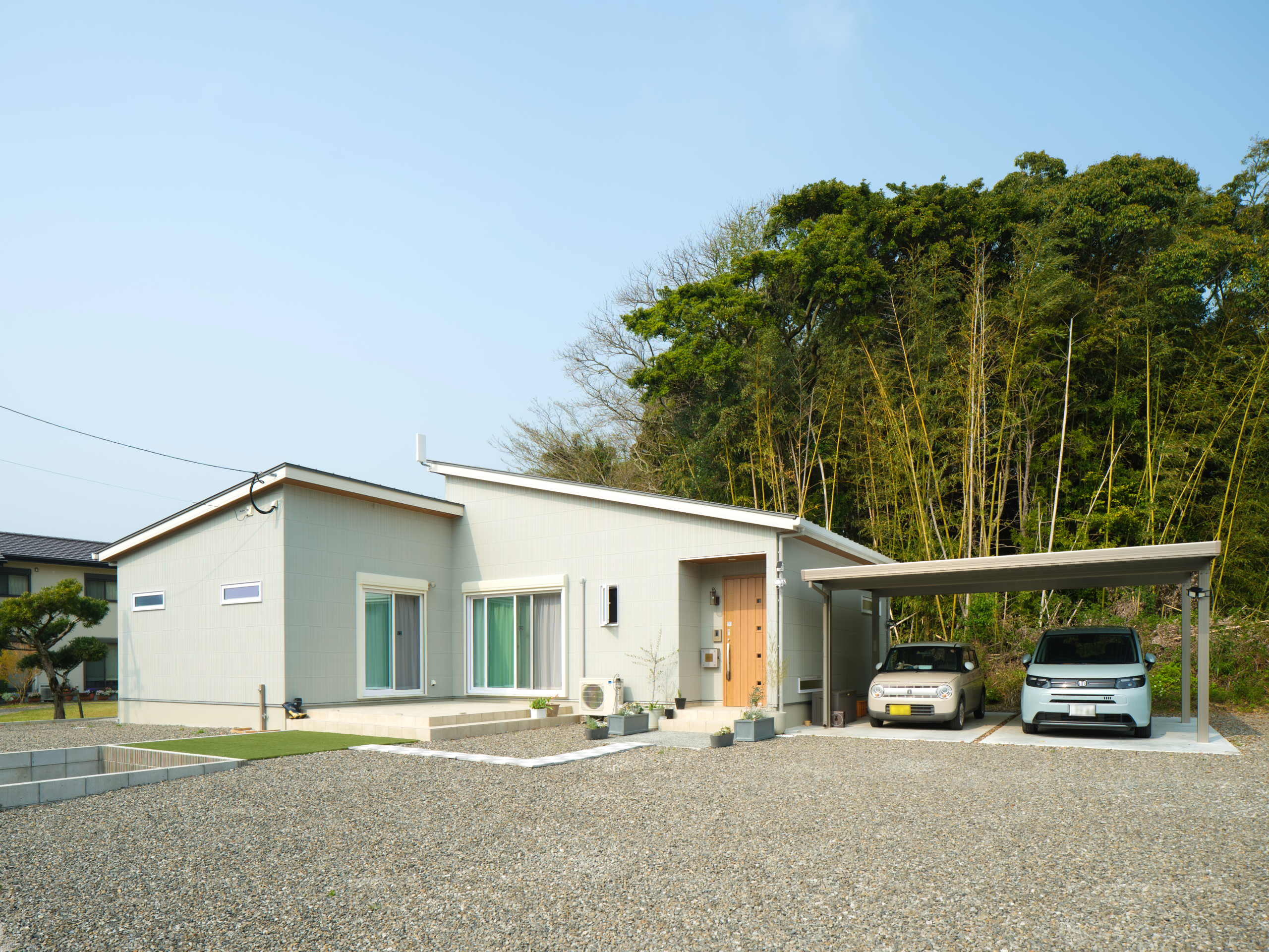やわらかなベージュカラーでまとめた、落ち着きのある平屋の外観。片流れ屋根のシンプルなデザインが、すっきりとした印象を与えます。広々とした敷地には駐車スペースもしっかり確保されており、ゆとりある暮らしを感じられる住まいです。