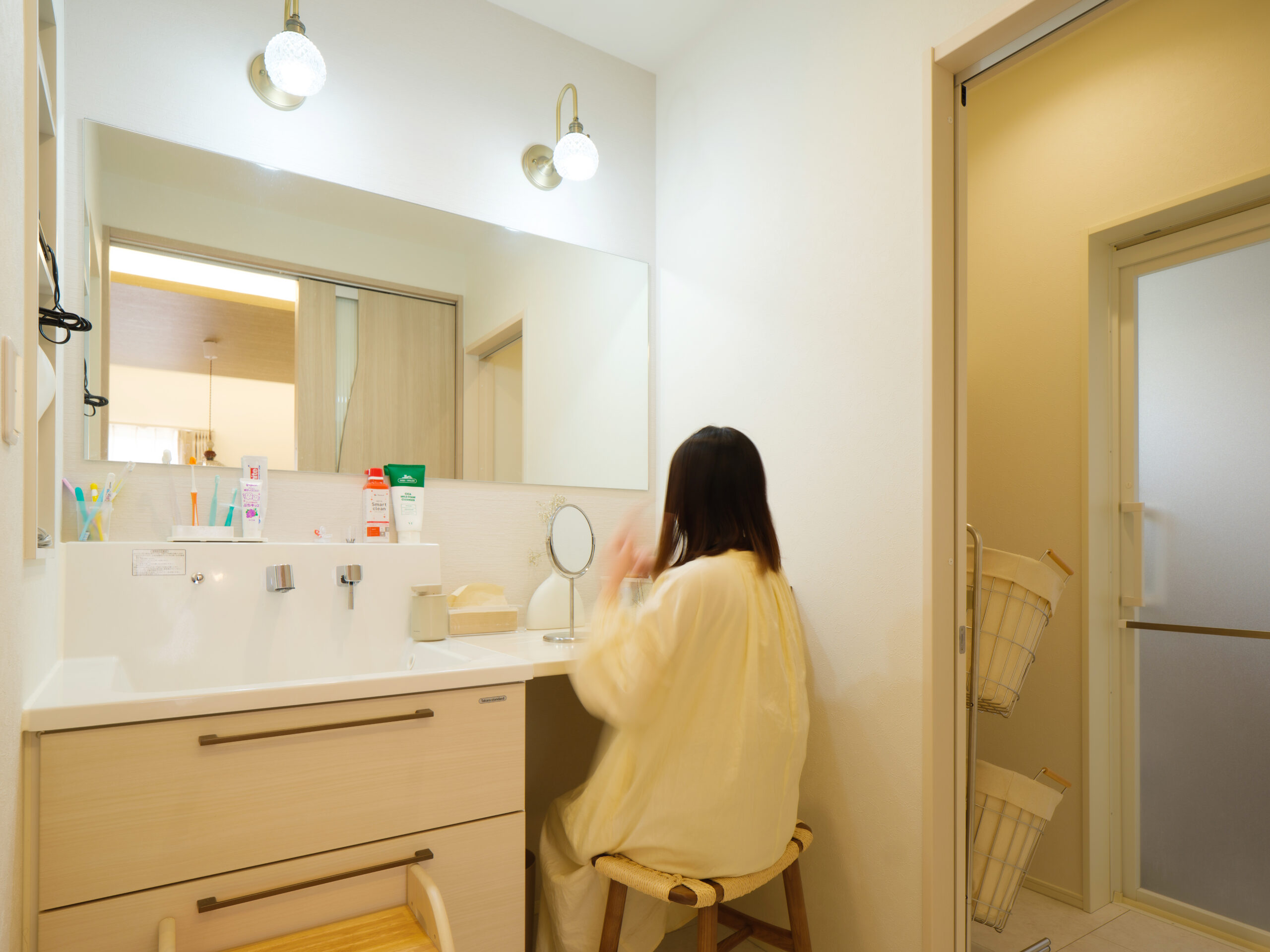 明るく清潔感のある洗面スペース。大きなミラーとゆとりのあるカウンターで、朝の身支度も快適に行えます。隣接する脱衣室ともつながり、動線の良さにも配慮された使いやすい空間です。