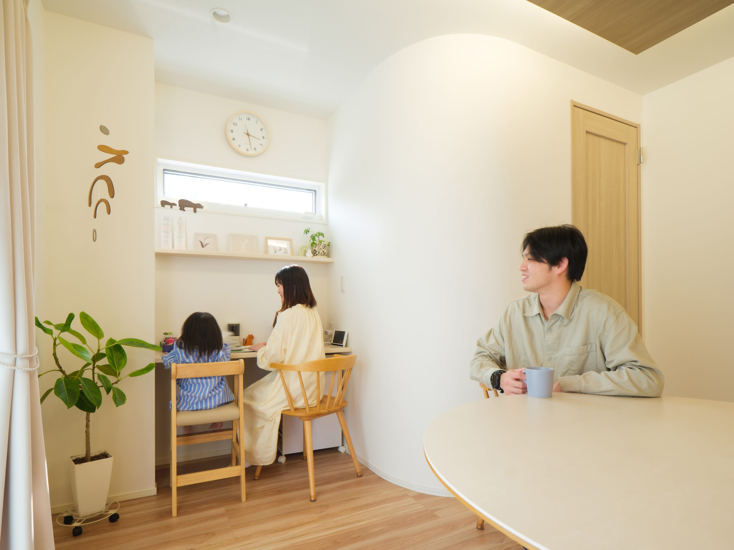 ダイニングの一角に設けたスタディスペースで、家族の気配を感じながら過ごせる空間。カウンターと収納棚を備え、勉強や作業がしやすい設計です。コンパクトながらも使い勝手が良く、日常に自然と馴染むスペースになっています。