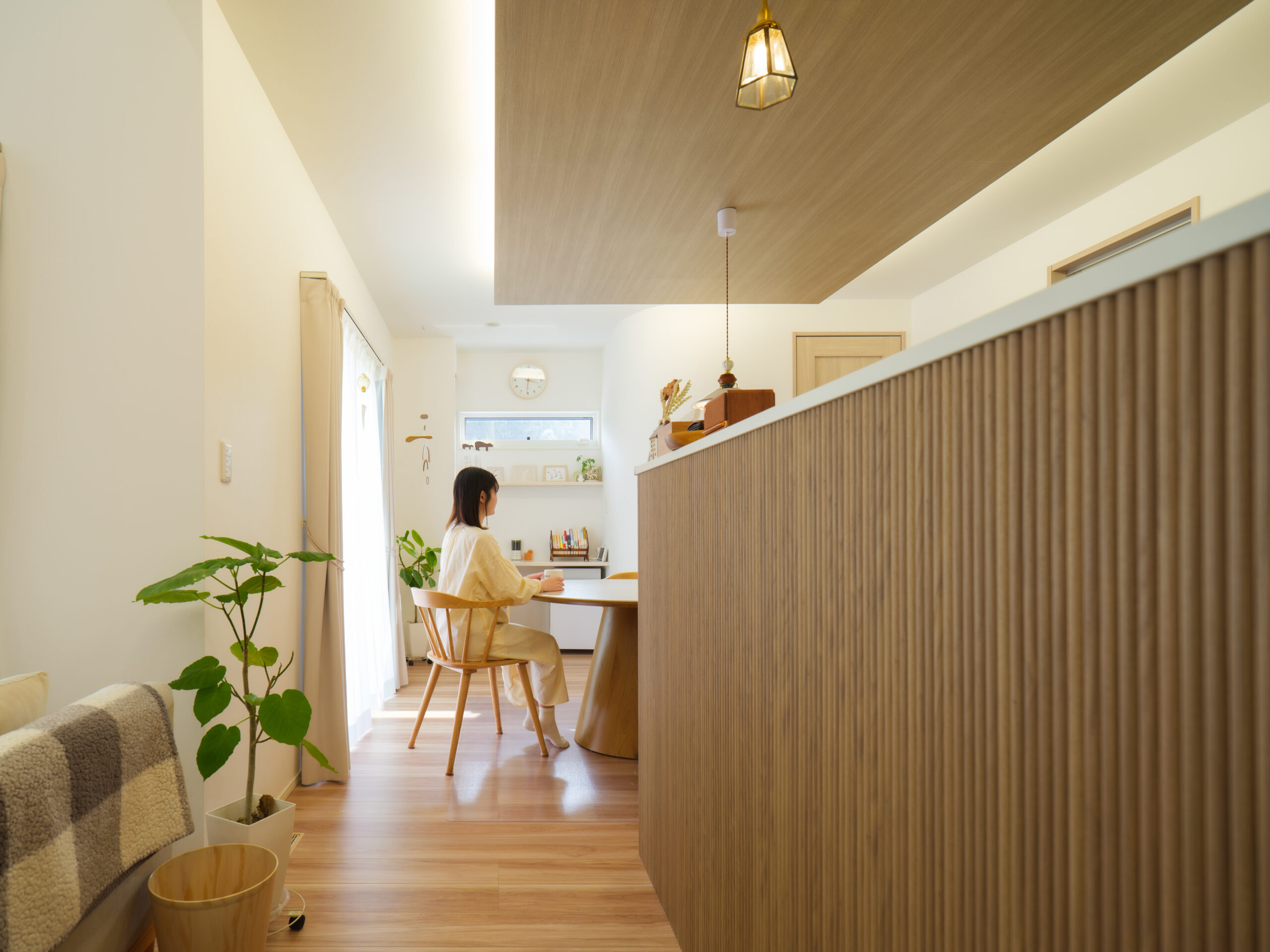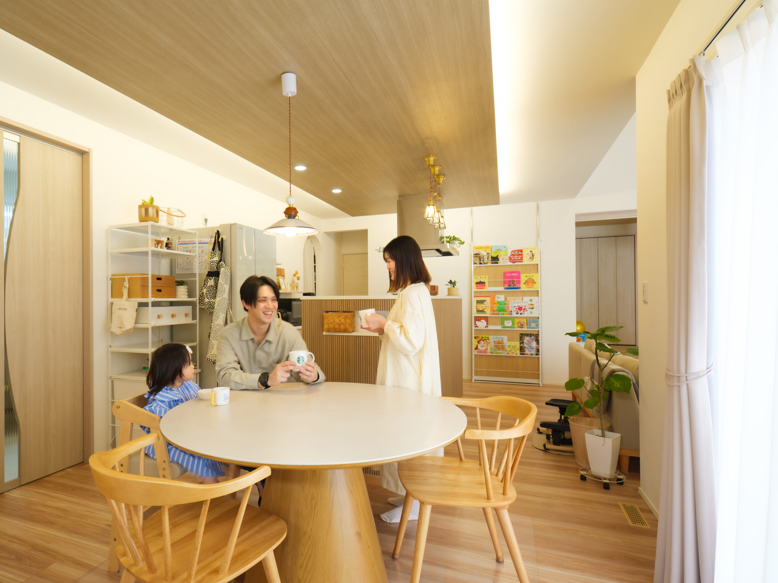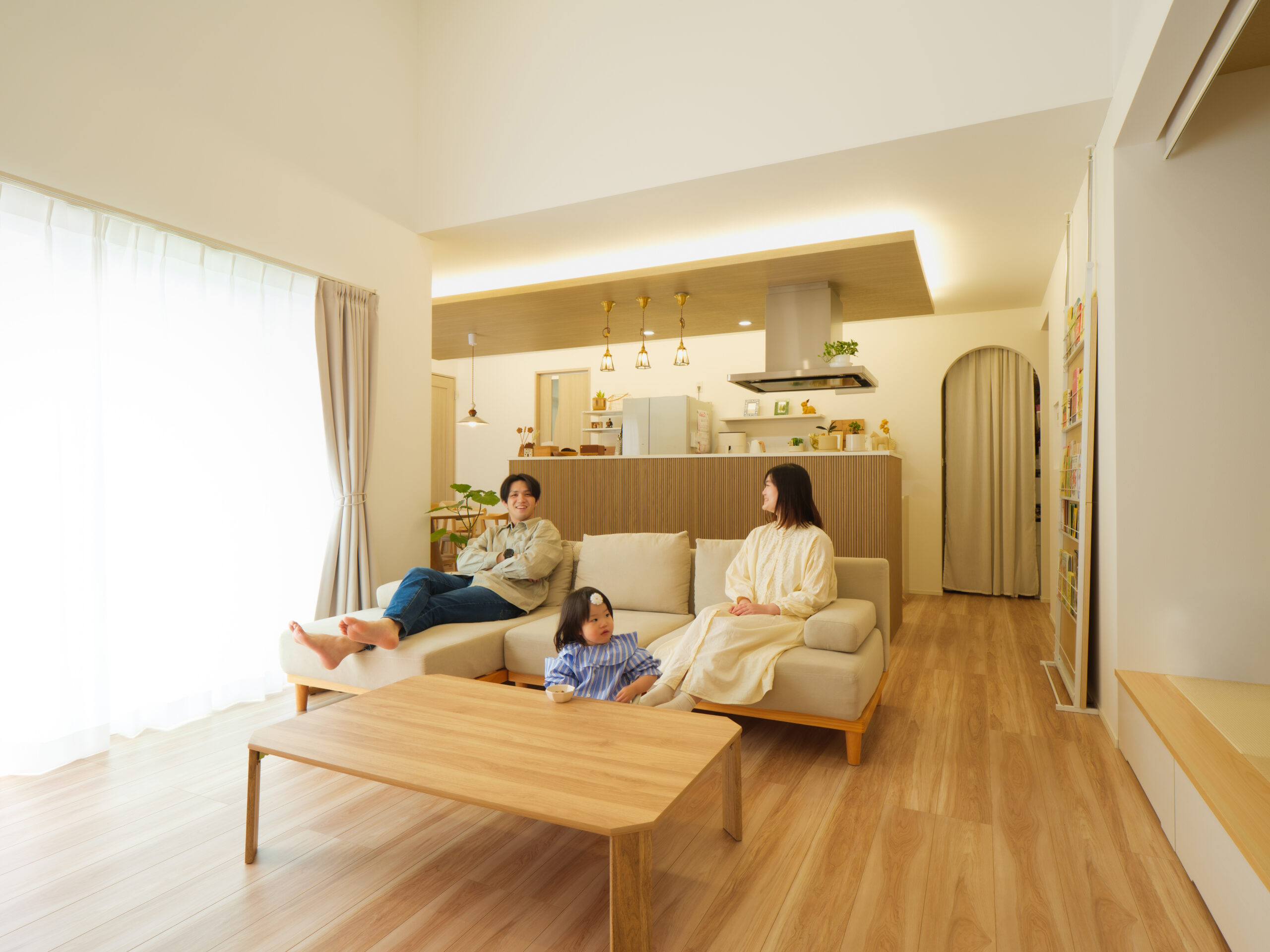 大きな窓からやわらかな光が差し込む、明るく開放的なリビング。木目を基調としたナチュラルな空間に、折り上げ天井や間接照明がアクセントとなり、上質な雰囲気を演出しています。キッチンまでゆるやかにつながる間取りで、家族が自然と集まる心地よい空間です。