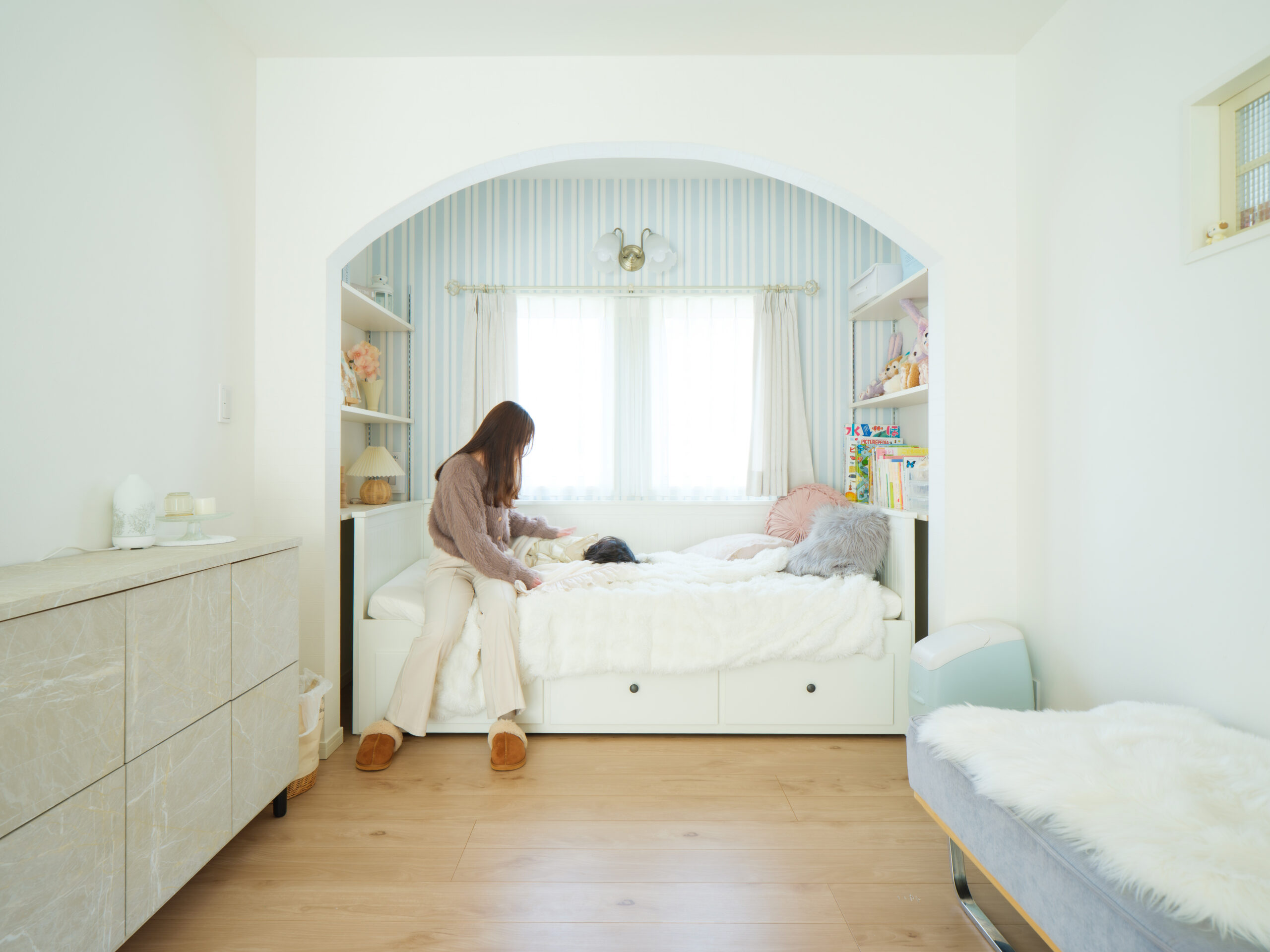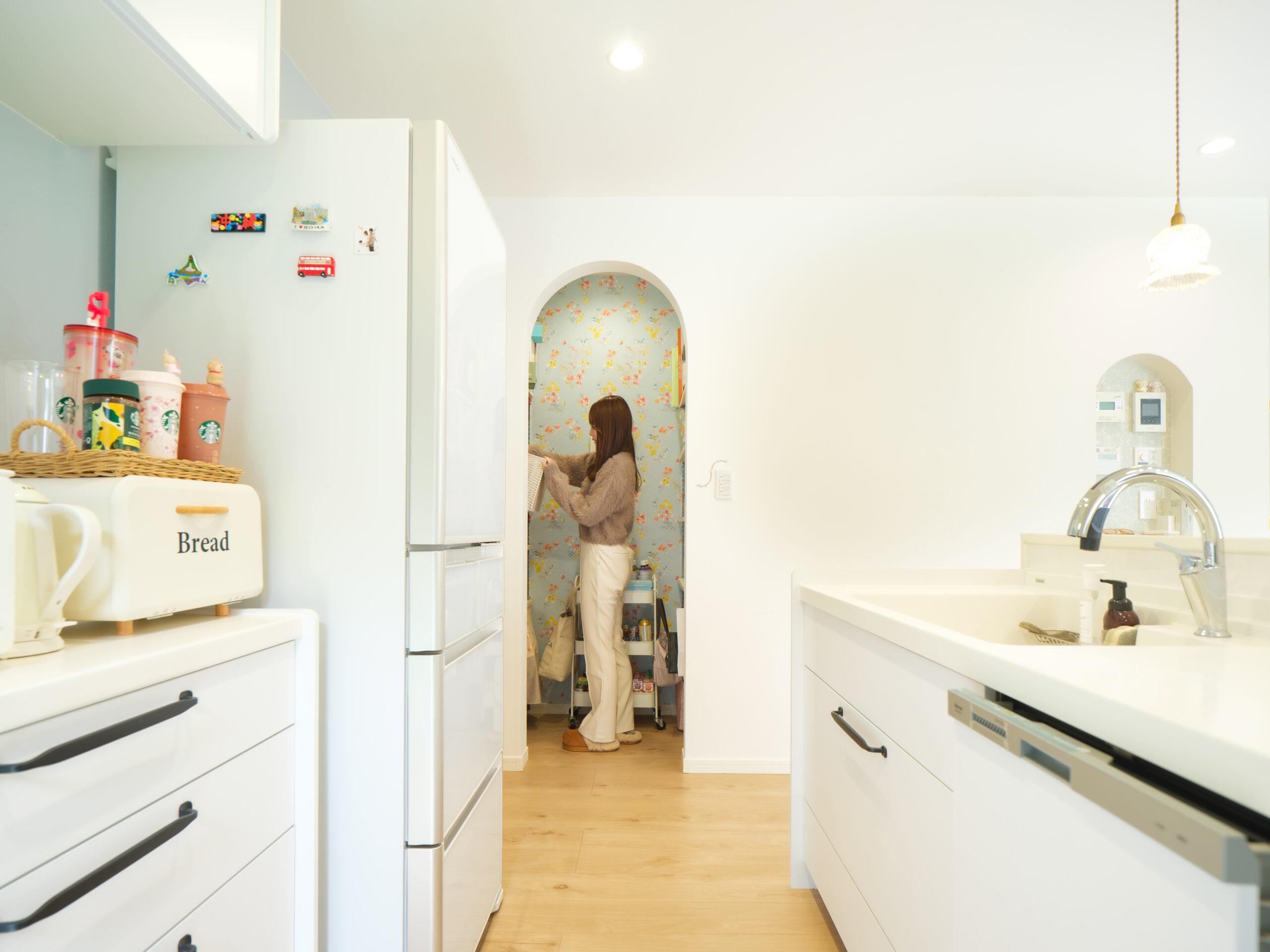 奥様の特等席であるキッチンは、見た目の美しさだけでなく機能性も追求しました。パントリーの入り口は、こだわりが光る可愛らしいアーチ型に。中には華やかな壁紙をあしらい、開けるたびに気分が上がる空間になっています。収納力も抜群で、調味料や食材のストックもスッキリ。デザインと実用性を両立させたパントリーは、日々の家事を楽しく、快適に支えてくれる心強い味方です。