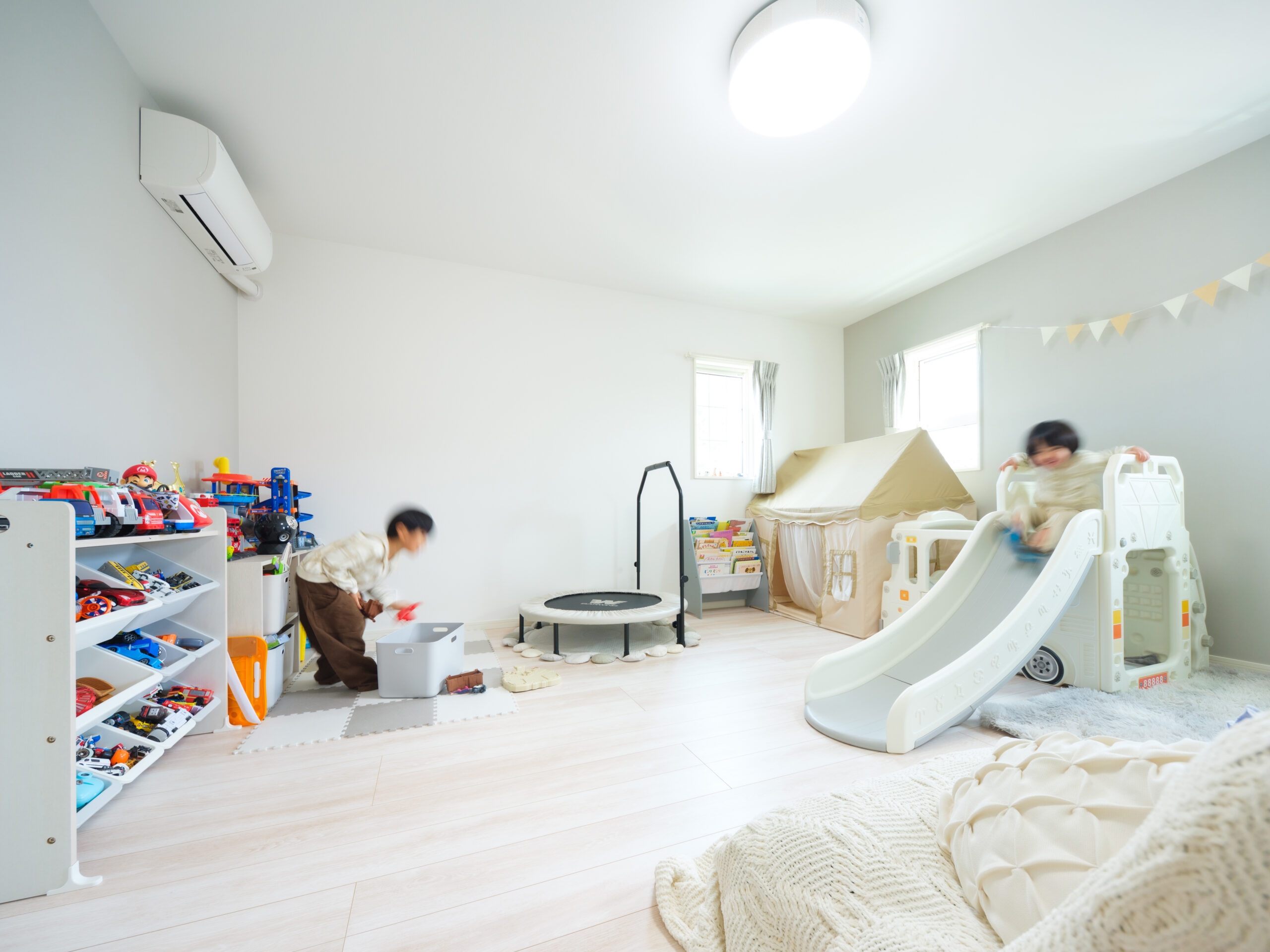 おやつでお腹が満たされたら、遊びスイッチがオン! 今の子ども室は、兄弟揃って思いっきり遊べる広々としたスペースとして大活躍です。滑り台やトランポリン、たくさんのおもちゃに囲まれて、のびのびと過ごしています。お施主様が「子どもたちが思い切り遊べる」とお気に入りの通り、二人揃って夢中で遊ぶ姿は、このお家での日常。賑やかで楽しい、子どもたちの城です