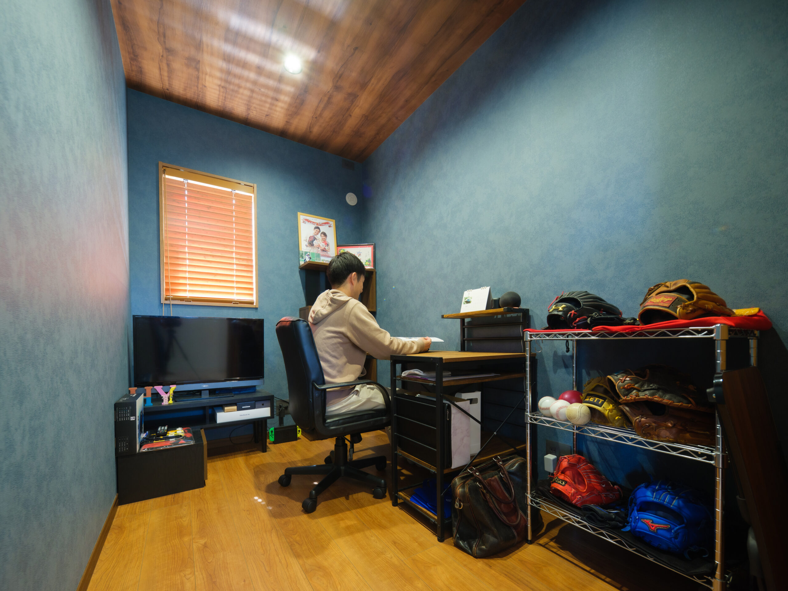 旦那様の憧れを詰め込んだ専用の書斎です。奥様がこだわった「お城のような可愛らしい雰囲気」とは一線を画す、深みのあるブルーの壁と木目調の天井が印象的なシックな空間に仕上げました。デスク周りには、旦那様の趣味である野球のグローブやボールが大切に飾られています。テレビや大きなデスクを配置し、趣味を楽しみながら作業にも集中できる、まさに大人の秘密基地のような、お気に入りのプライベート空間です。