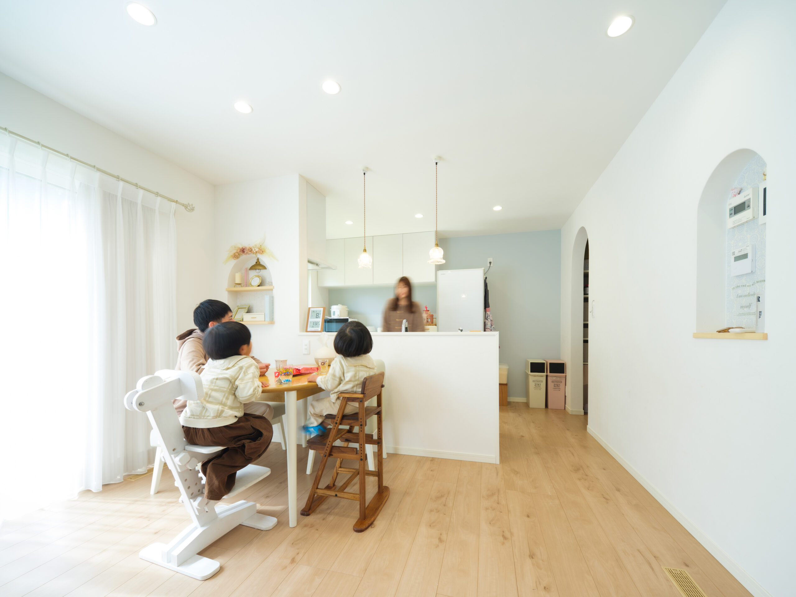 目が覚めた次男くんも合流し、家族揃っておやつタイムが始まりました。大きな掃き出し窓から自然光が降り注ぎ、空間全体が明るく開放的。対面型のキッチンは、お子様たちの様子を常に見守れる奥様の「特等席」になっています。そんな素敵な雰囲気ですが、子どもたちは目の前のおやつに夢中なようで(笑)。賑やかで幸せな時間が流れる、LDKでの心温まるひとときでした。