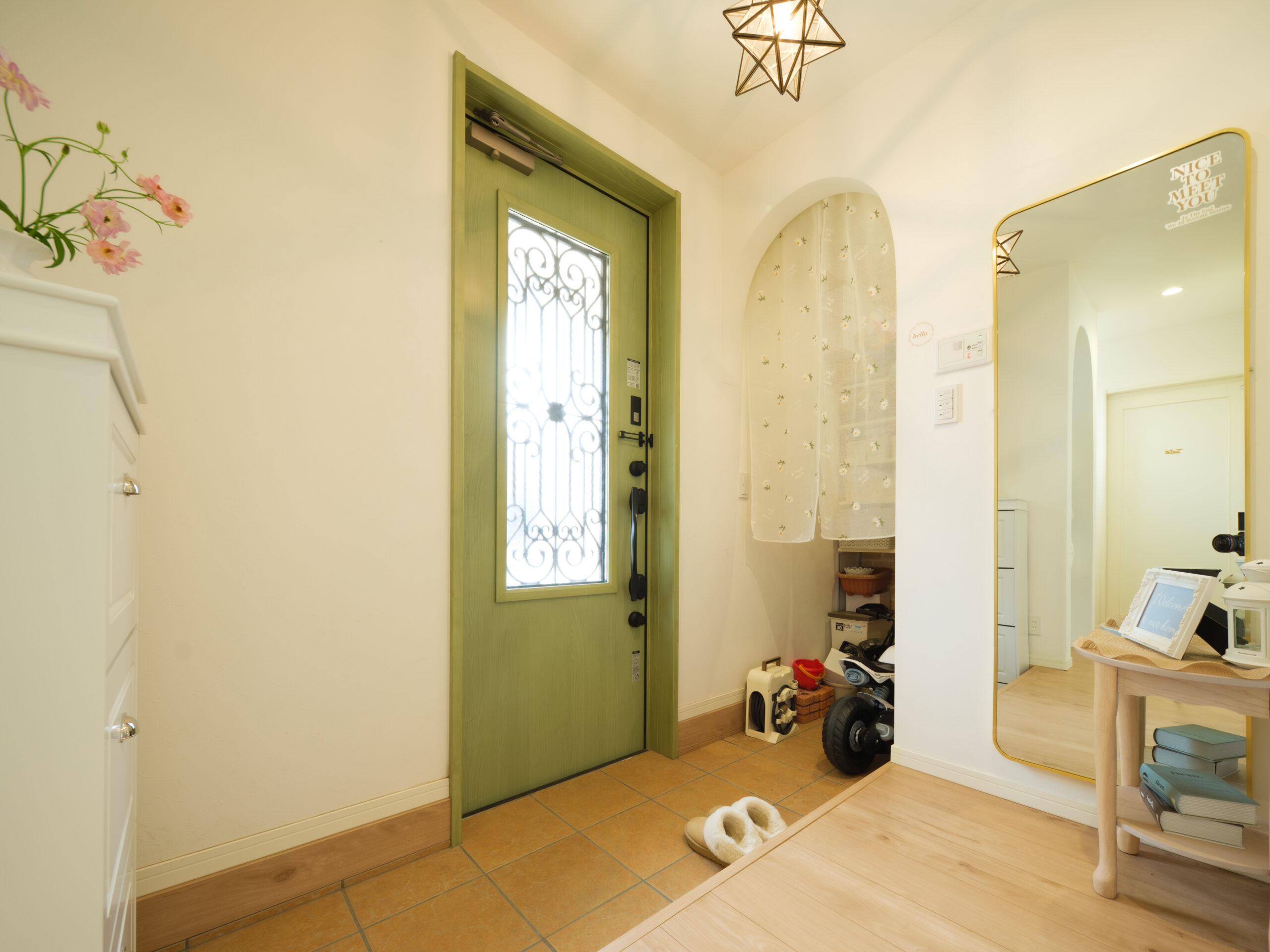 明るい光が差し込む玄関は、白壁に映える爽やかな若草色のドアが印象的。アイアンの装飾や星型のライト、ゴールドフレームの鏡など、一つひとつのアイテムにこだわりを感じます。アーチ型の収納スペースや、そこに飾られたお花、ナチュラルな木の家具が温かみを添え、フレンチカントリー調の可愛らしい雰囲気を演出。訪れる人を優しく迎え、毎日の帰宅が楽しみになるような、愛着の湧く空間に仕上がっています。