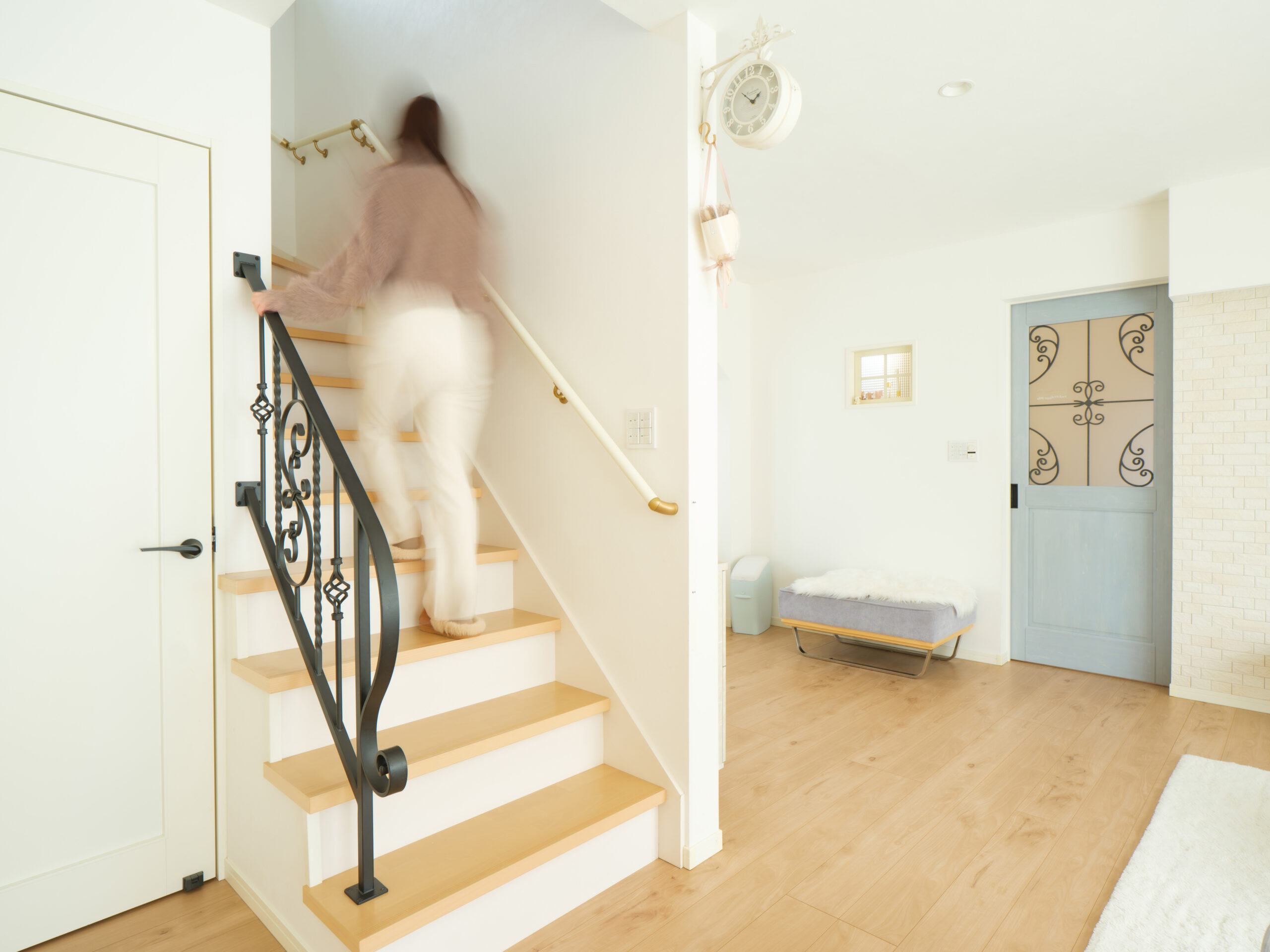 次男くんを起こさないよう、足音を忍ばせて2階へと向かいました。階段を上がると、そこには1階の可愛らしい雰囲気と見事に調和した、統一感のある美しい空間が広がっています。 特に目を引くのは、細部までこだわりが宿る階段の手すりです。アイアンの繊細なラインが、白を基調としたインテリアに洗練されたアクセントを添えており、お施主様の高いセンスが随所に光っていました。