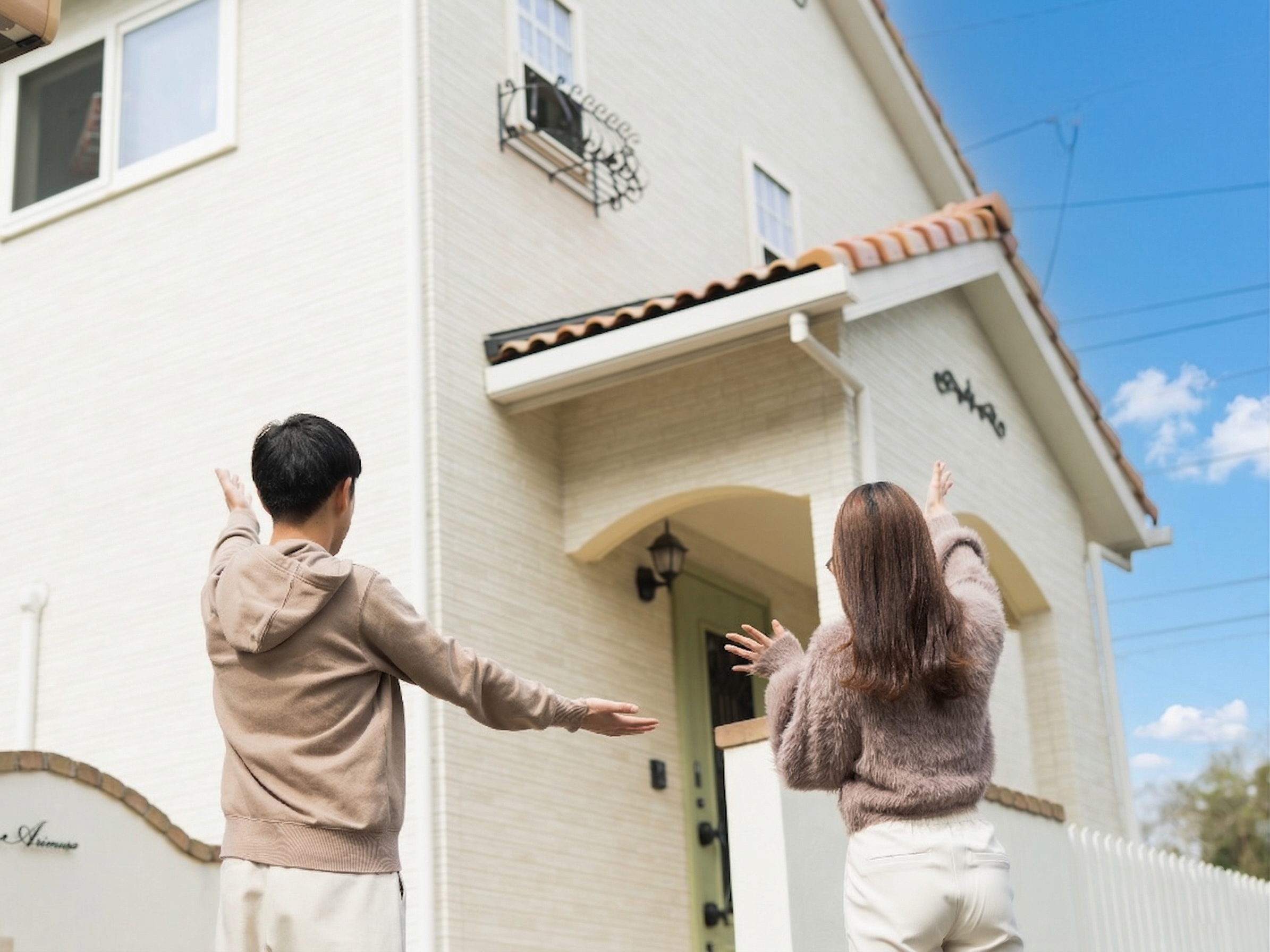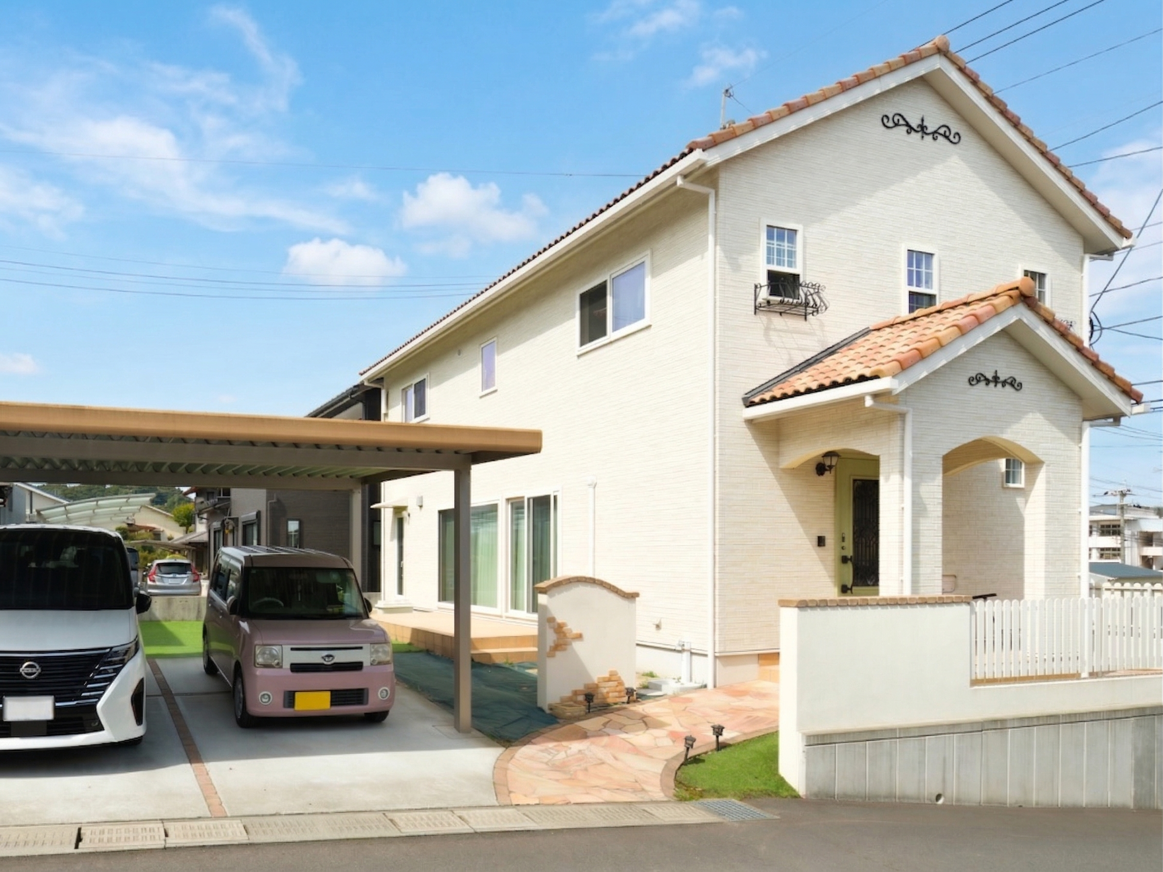 白を基調とした明るい外壁と、温かみのあるオレンジ色の瓦屋根が特徴の、南欧風(プロヴァンス風)の外観です。玄関ポーチや外構の壁に採用されたアーチ(アール)形状が、訪れる人を優しく迎えます。鋳物風の装飾や明るい玄関ドアが、可愛らしい雰囲気を演出。リビングから続く広いタイルデッキは家族のくつろぎの場となり、2台分のカーポートも完備で、機能性も兼ね備えた憧れの住まいです。