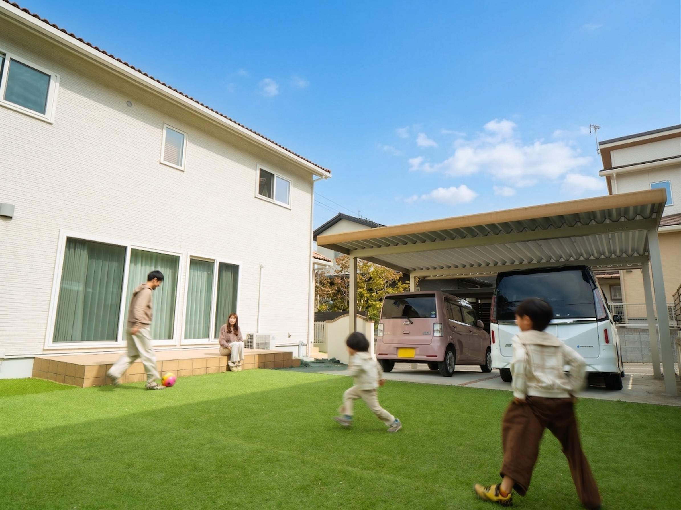 青空の下、元気いっぱいの子供たちは広いお庭へGO!ボール遊びをしたり走り回ったり、人工芝が敷かれたスペースは絶好の遊び場です。リビングから繋がるタイルデッキもお施主様のこだわり。もう少し暖かくなったら、ここを活用してBBQを楽しむ予定だそうです。外の空気を感じながらのびのび遊べる開放的な空間。家の中も外も家族の笑顔が絶えない、暮らしを豊かに彩る素敵なプライベートガーデンです。