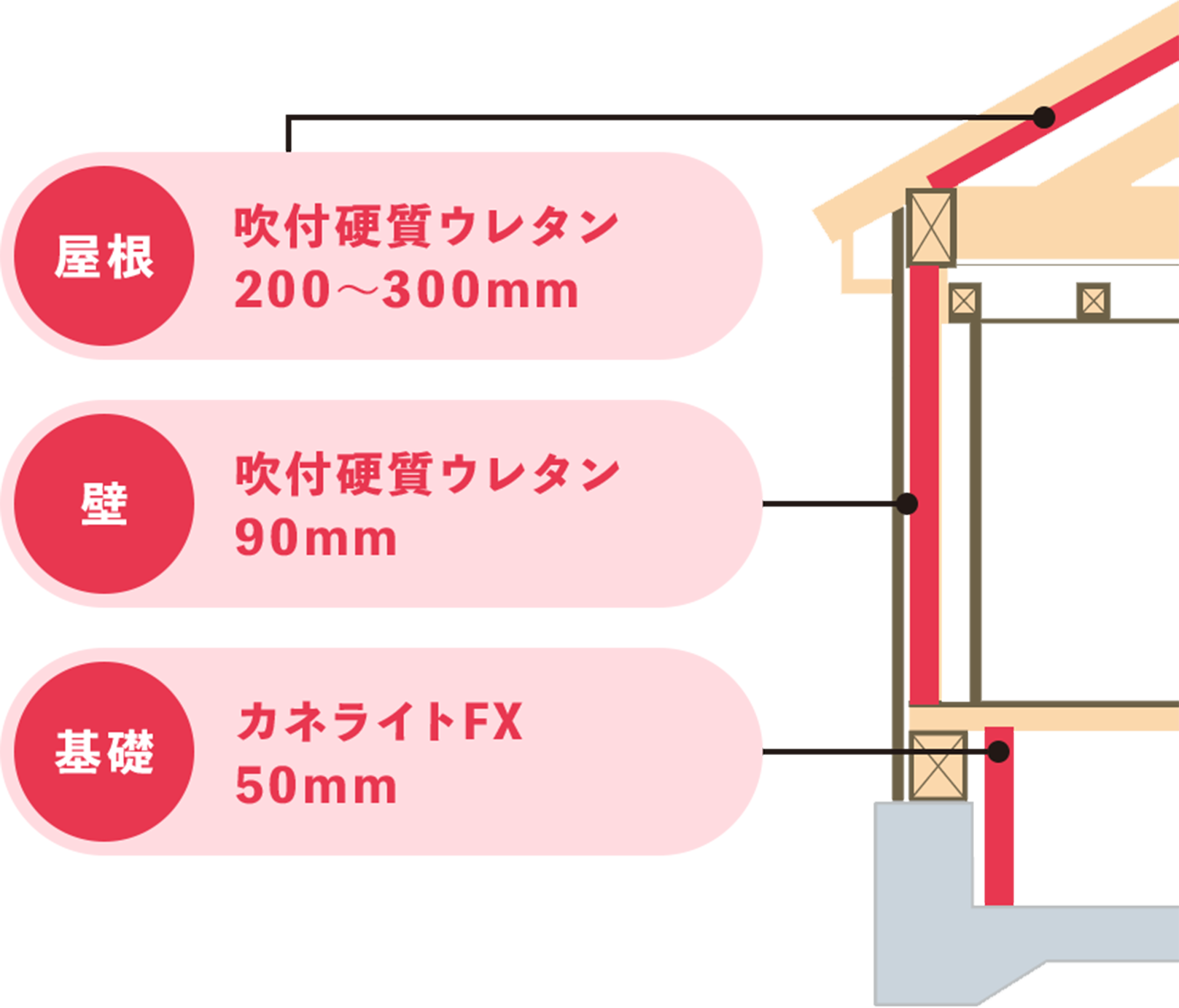 屋根と壁の内側に断熱材を入れることで、断熱効率をアップ。外気を遮断すると同時に、室内の冷暖房の熱を逃がしません。