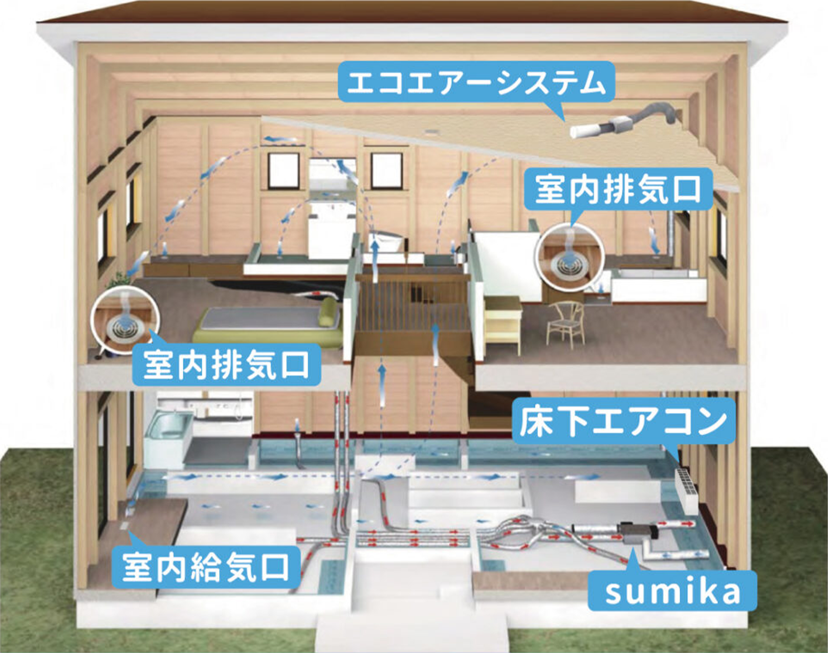 花粉除去率99.8%、PM2.5除去率98%を誇る換気システムを採用。室内を常に新鮮な空気できれいに保つだけでなく、断熱性が高く、暖まりやすく・暖かさを逃さない環境をつくってくれます。