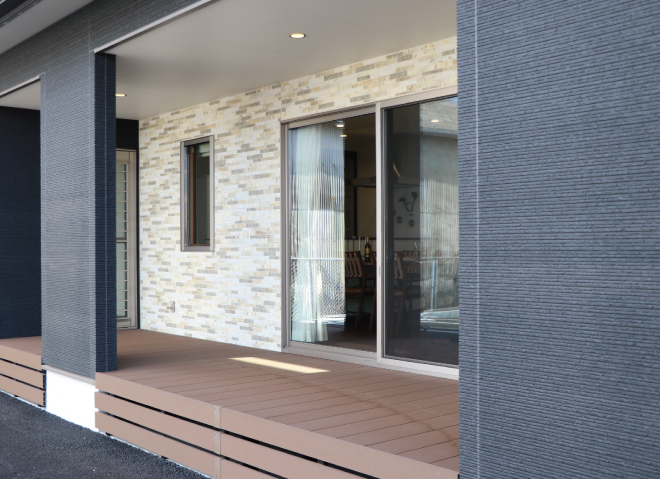 落ち着いた色合いと、多用途に使えるテラスが広々とした空間をつくる平屋のモデルハウス。