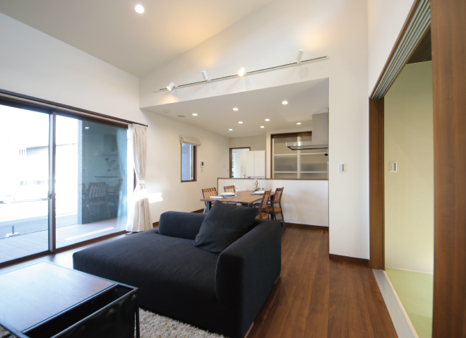 大きな窓から明るい自然光がたっぷり注ぐ日当たりの良いリビング。そのままシームレスにテラスへと出ることができ、家事動線もスムーズに。