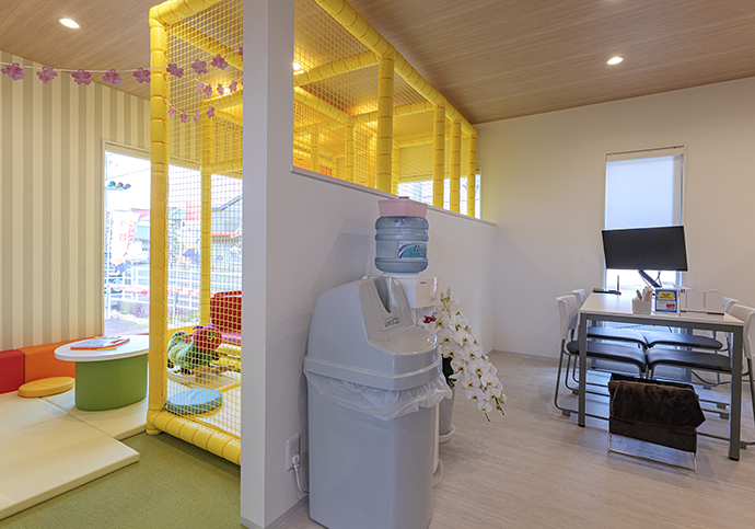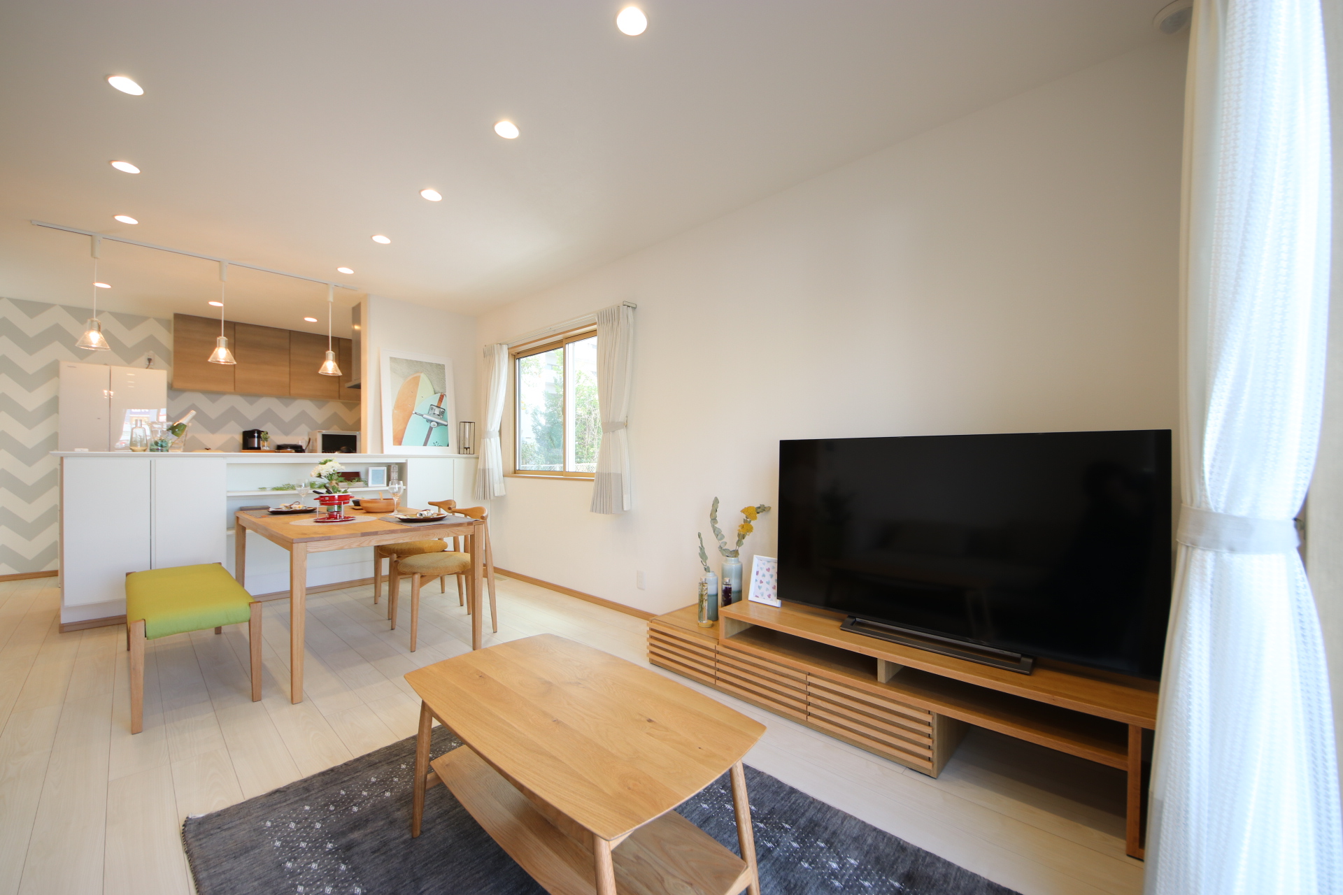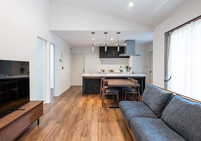 落ち着いた色合いと、多用途に使えるテラスが広々とした空間をつくる平屋のモデルハウス。