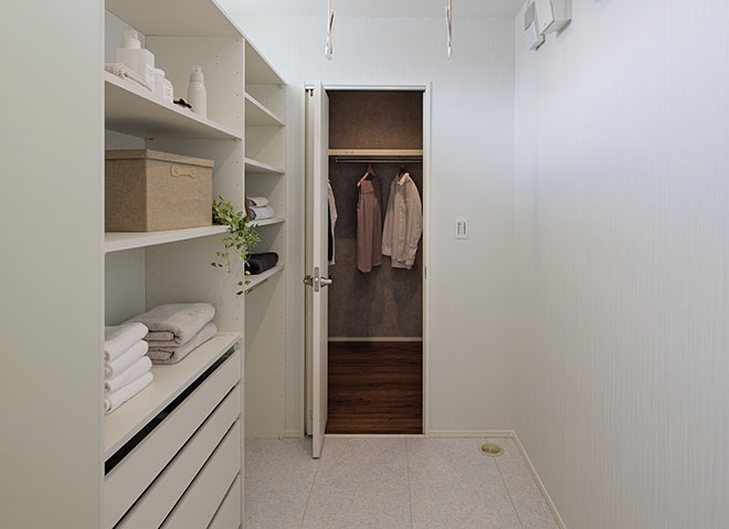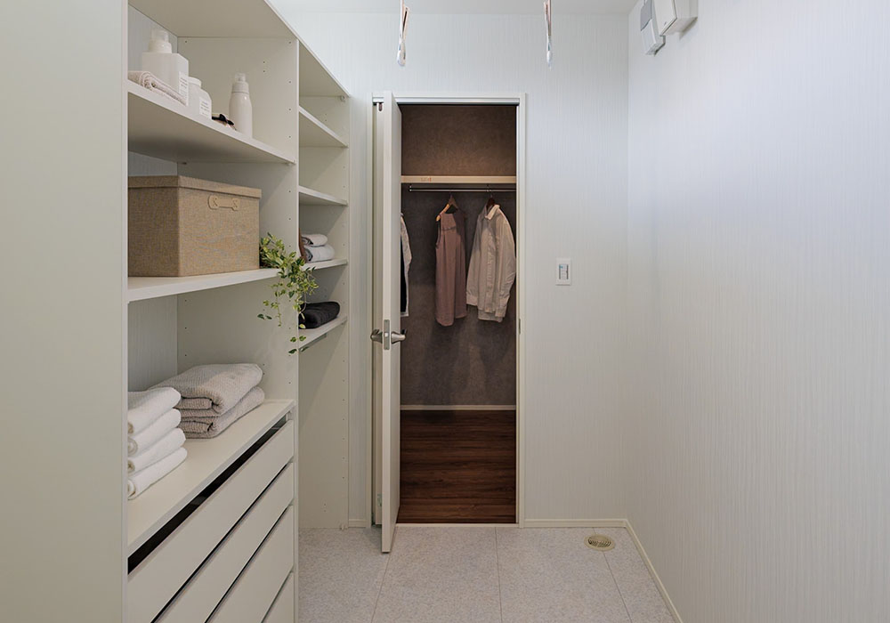 ランドリースペースはWICと洗面脱衣室につながっており効率的に洗濯や収納が行えます。