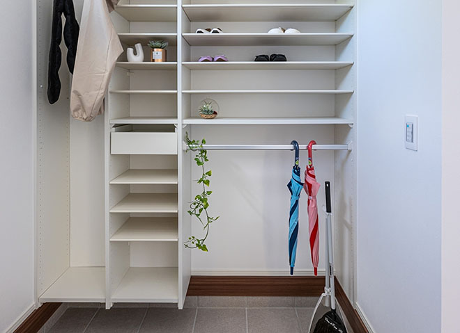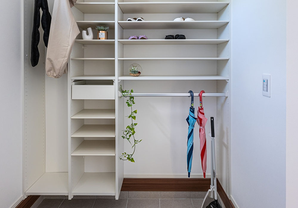 たっぷり2帖のシューズクロークは可動棚になっており、効率よく靴や趣味用品を収納可能です。
