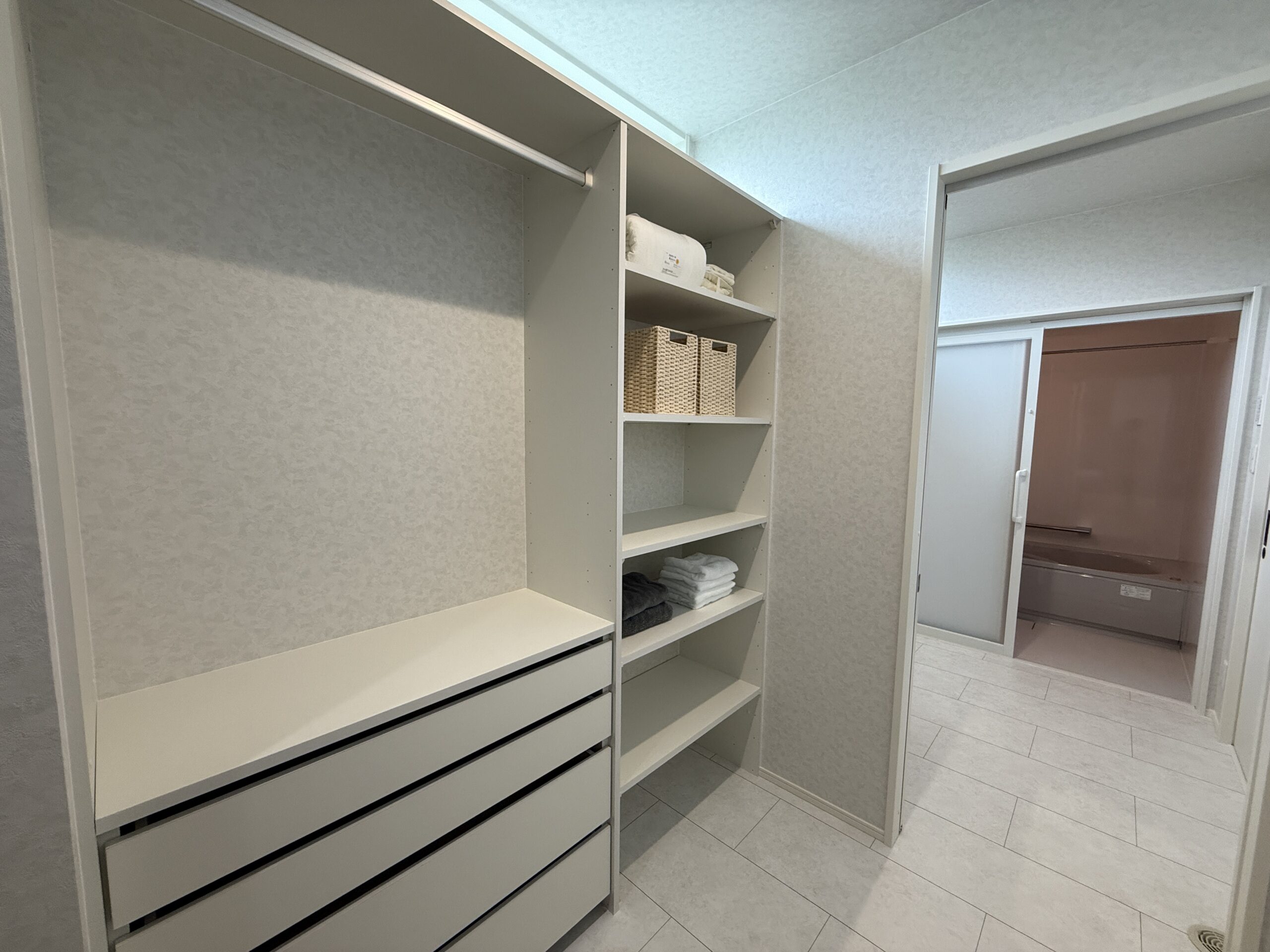 タオルや衣類をたっぷり収納できる棚と引き出しを備えた脱衣所。洗面・浴室と直結しているため家事動線もスムーズで、使いやすさと整理のしやすさを兼ね備え、毎日の生活をより快適にしてくれます。