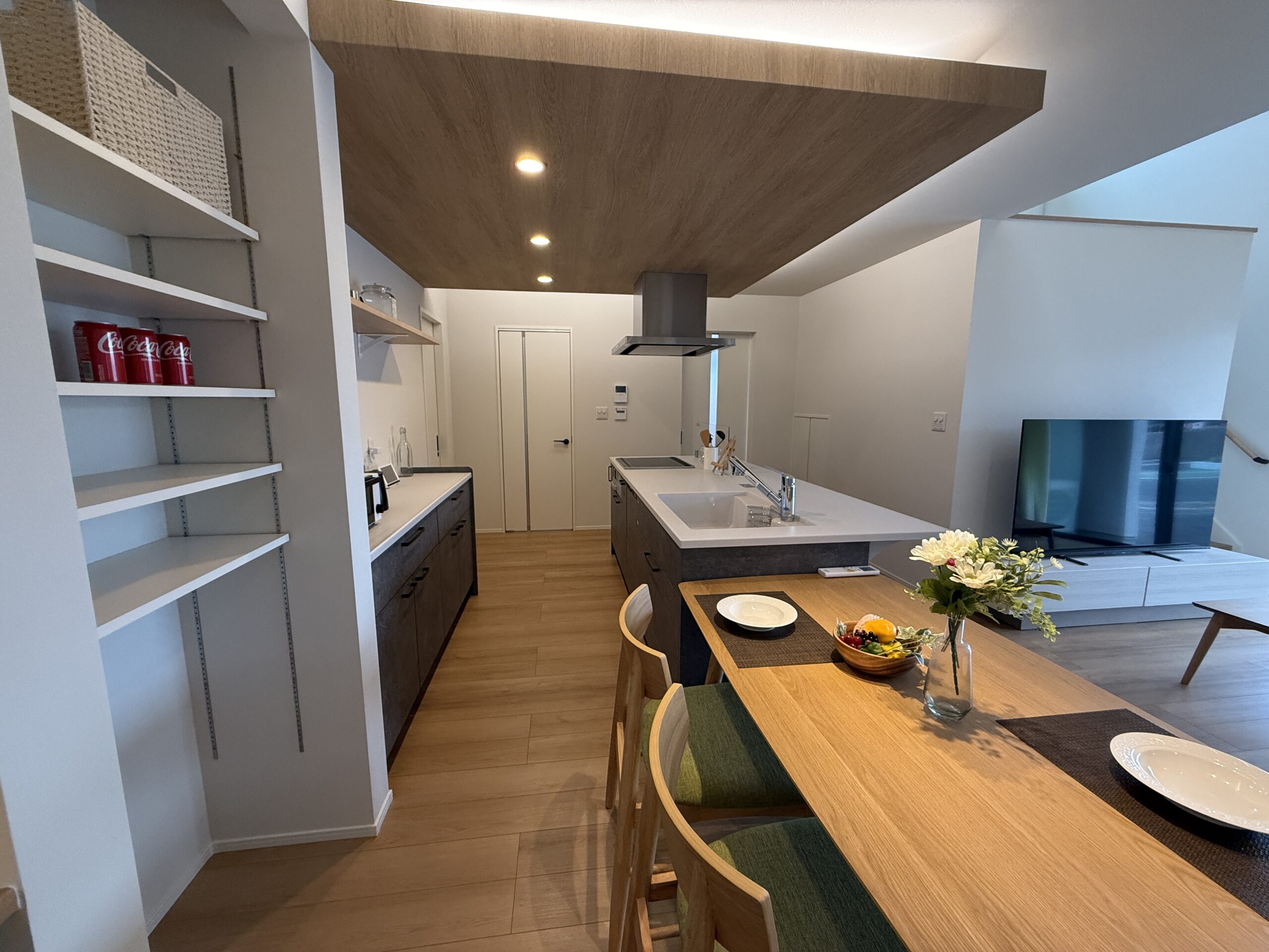 ダイニングとキッチンが一体となった空間は、家族が自然と集まる憩いの場。料理をしながら会話が弾み、毎日の食卓が楽しい時間に変わります。