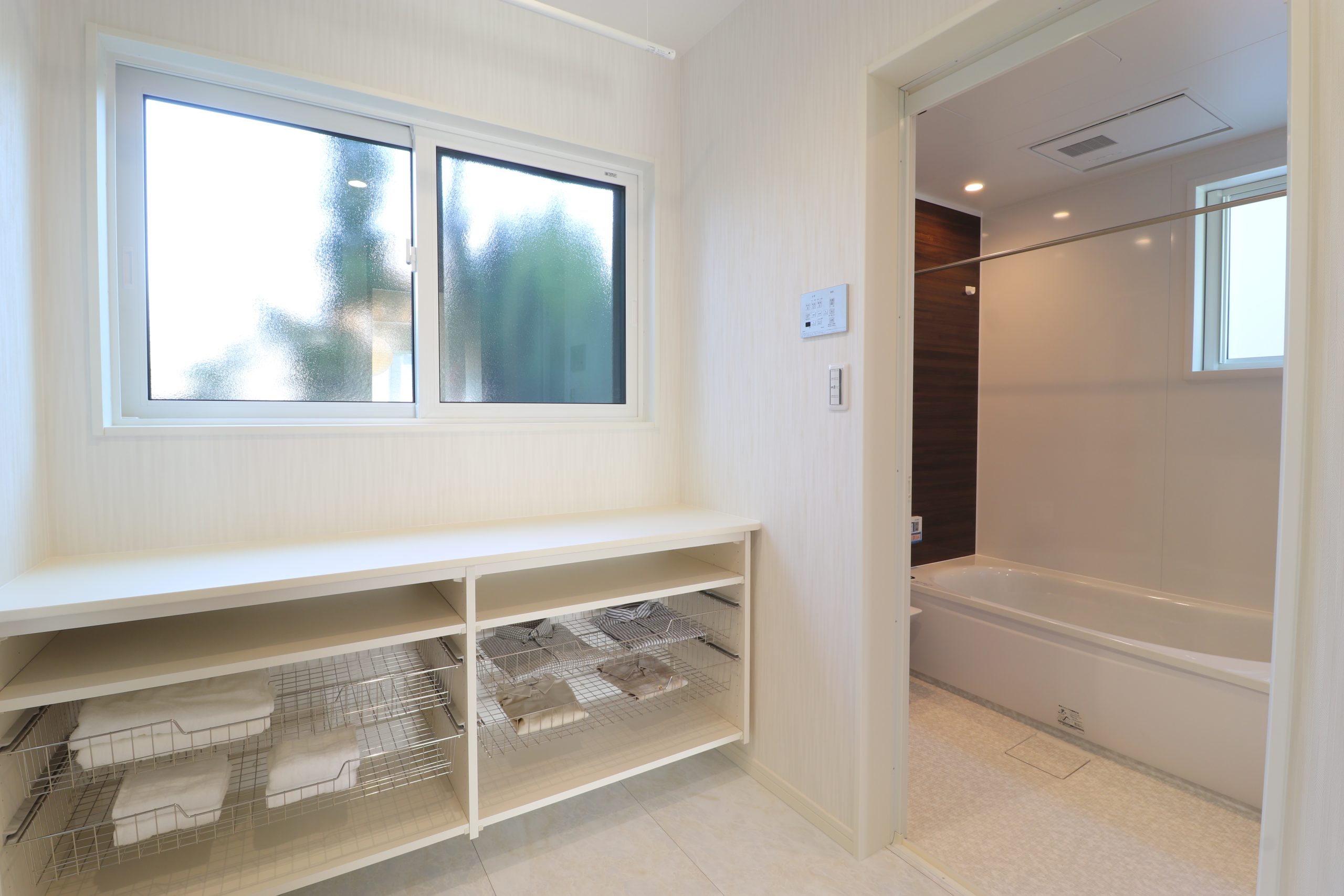 キッチンと手洗いの2動線からつながる脱衣所には、造作の棚。