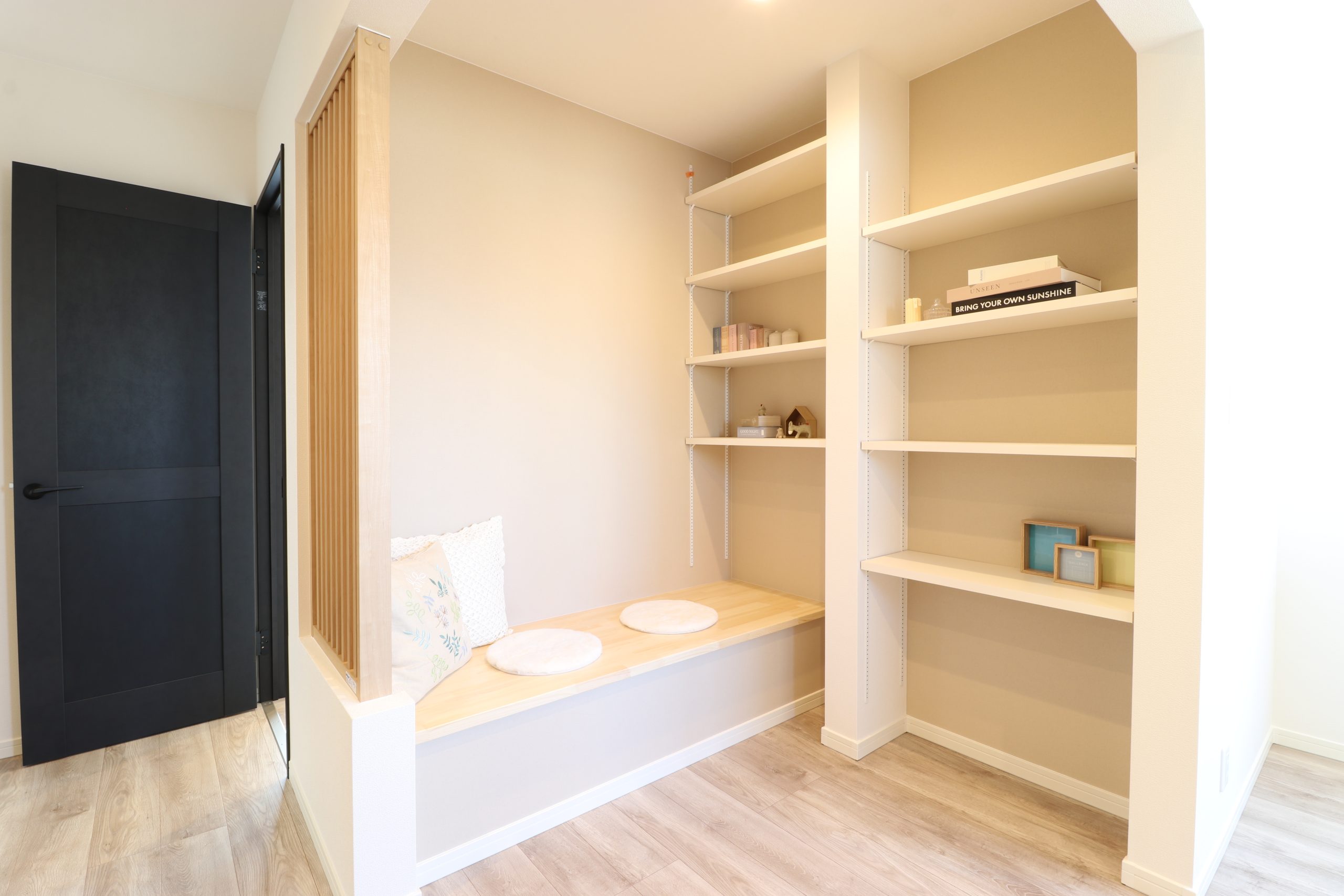 小上がりの段差に腰掛け、読書を楽しめる空間は、お子様だけではなく、大人も落ち着ける空間。