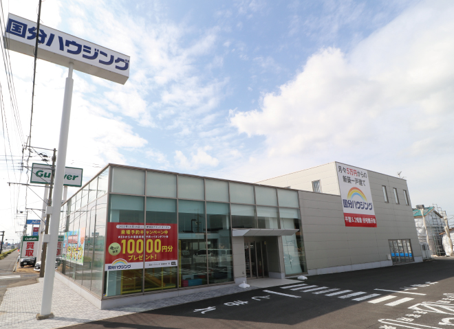 たっぷりの駐車場を備えた国道沿いの店舗。