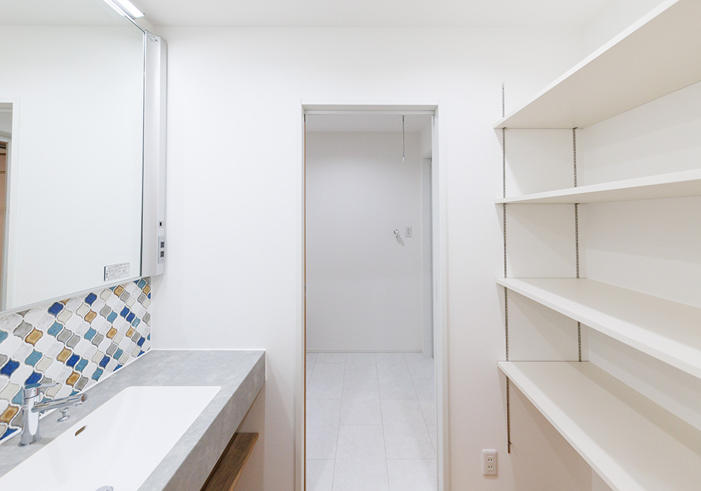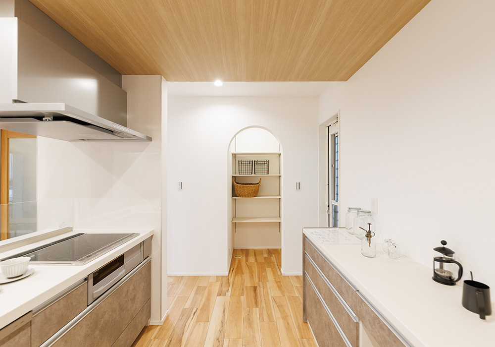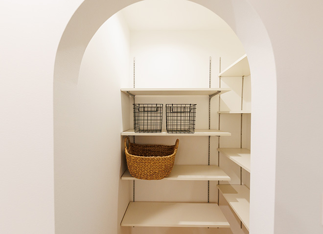 "キッチン横のパントリーは、キッチンをスッキリと保つための強い味方。