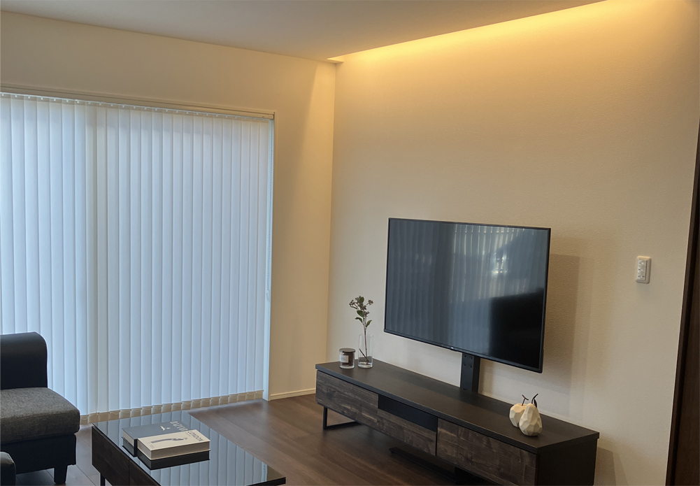 大きな窓からたっぷりの陽光が差し込む、明るく開放的なリビング。広々とした空間は、家族みんながゆったりとくつろげる心地よい場所です。