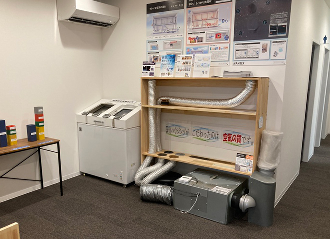 国分ハウジングの標準となっている断熱性能や24時間熱交換換気システムなどを体感できるコーナーも完備。
