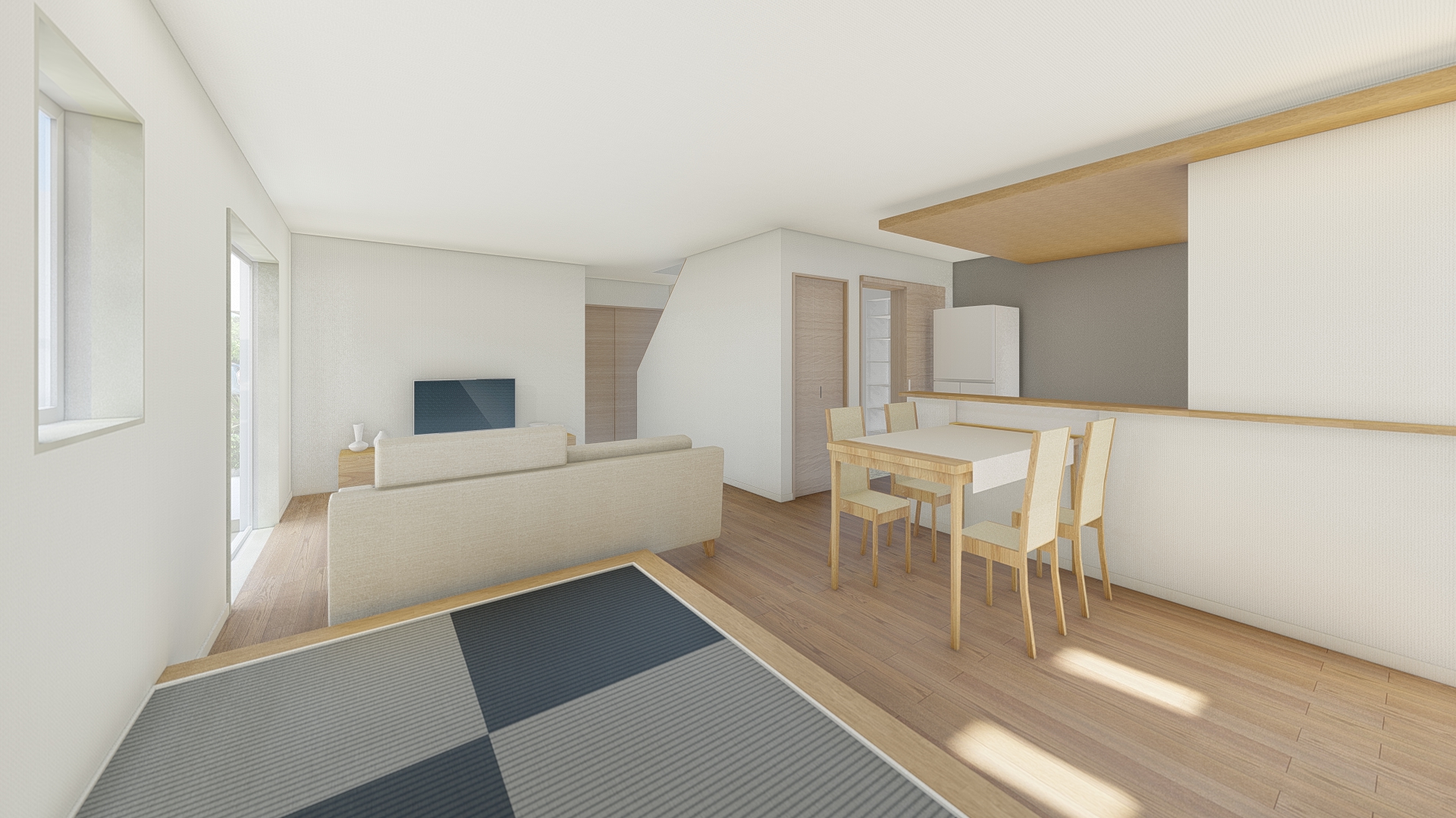 開放感あふれるLDKに、ひときわ目を引く小上がりの畳スペース。リビングの一角に配置されたこのエリアは、家族のくつろぎの場としてはもちろん、子どもの遊び場や来客時の簡易客間としても重宝します。モノトーンの配色がモダンで洗練された印象を与え、和の趣と現代的なデザインが融合した落ち着きある空間です。