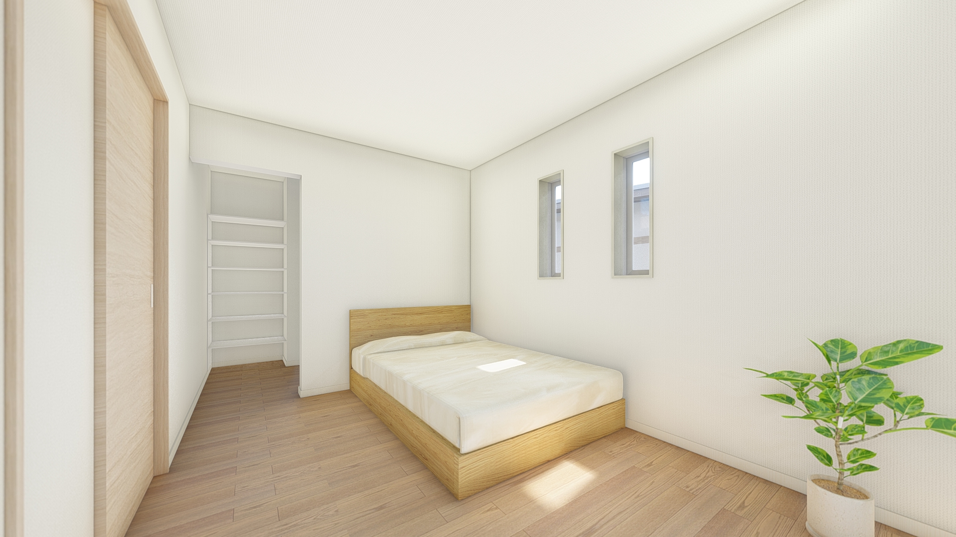 ベッド奥に設けられたウォークイン収納は、衣類や小物をスマートに整理できる頼れるスペース。生活感を抑えつつ、毎日の準備を快適にサポートします。