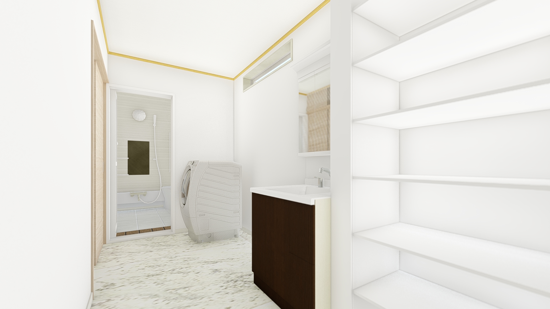 洗濯機のすぐ先には浴室が配置されており、脱ぐ・洗う・干すが一連の流れで完結。毎日のルーティンを無理なくサポートしてくれる設計です。