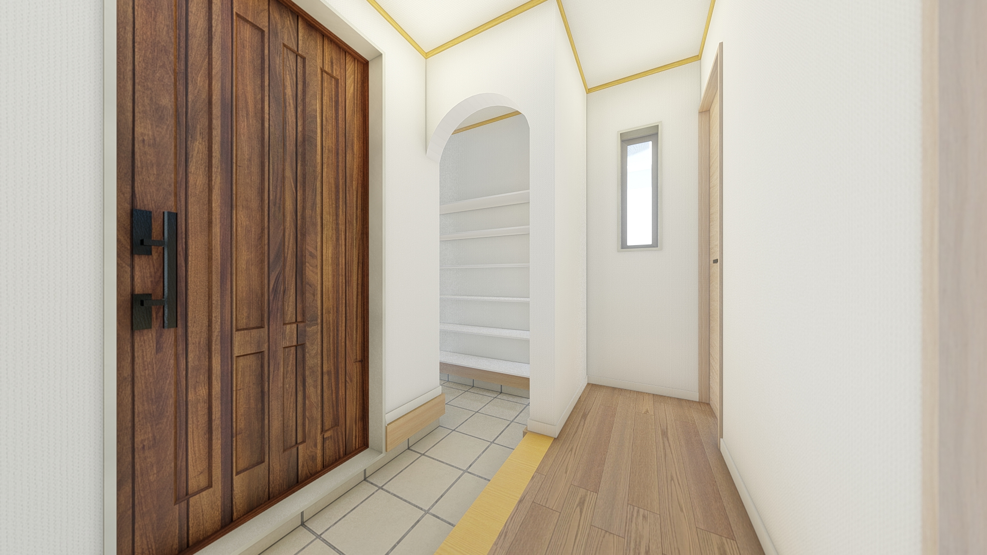 目を引くアーチ状の開口部の奥には、実用性の高い土間収納を配置。日常使いの靴やベビーカー、アウトドア用品などもたっぷりと収納できる広々スペースで、玄関まわりをすっきりと保てます。デザイン性と使い勝手を両立した設計です。
