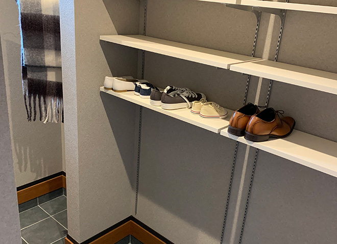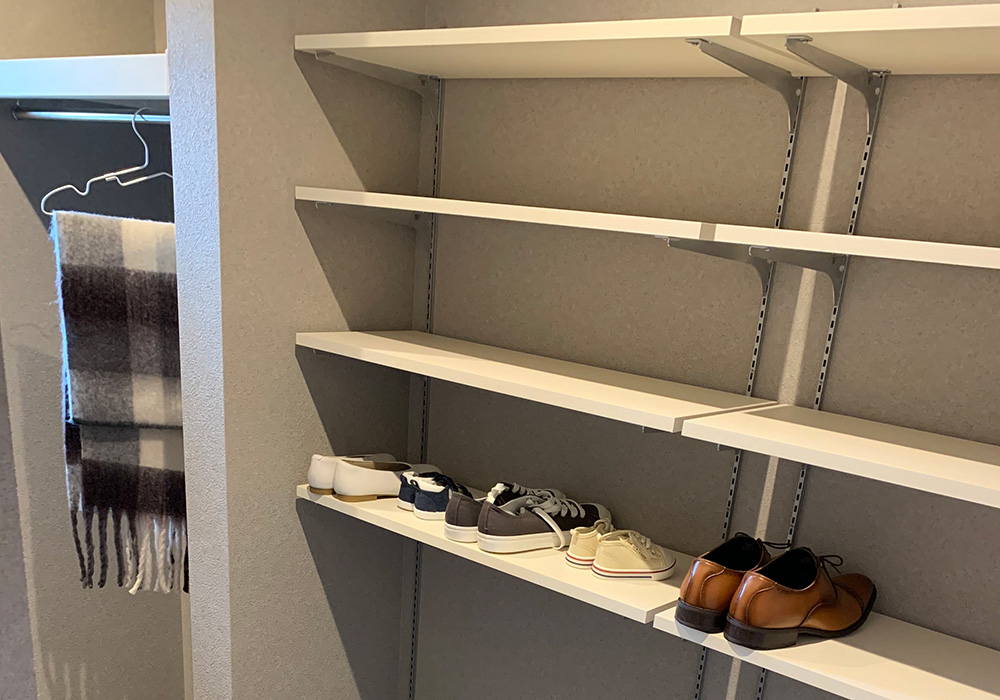 シューズインクローゼットには、可動式の棚を設置しているので、ブーツやレインブーツなど、高さのあるものも収納できます。