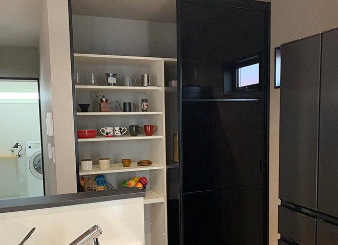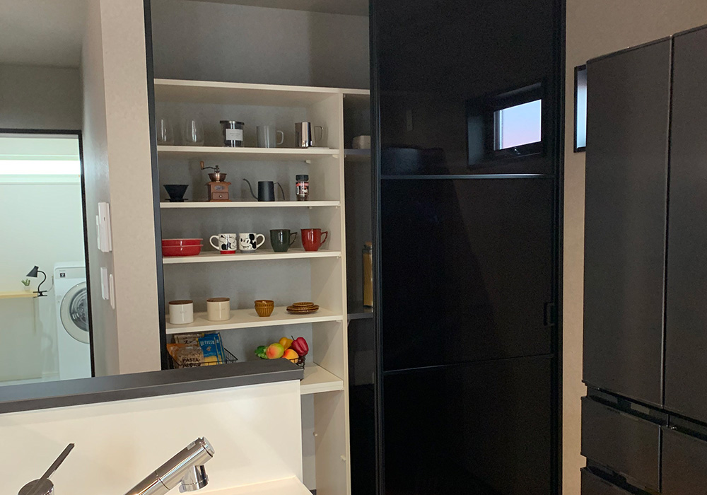 キッチン横のパントリーは、キッチンをスッキリと保つための強い味方。
